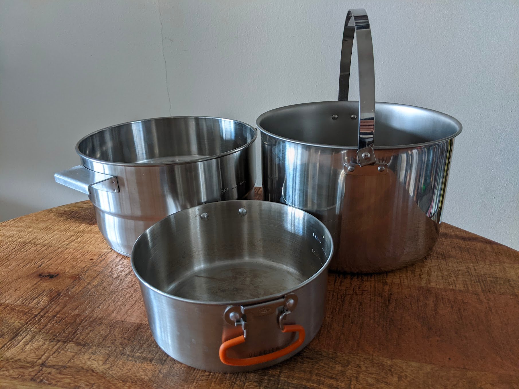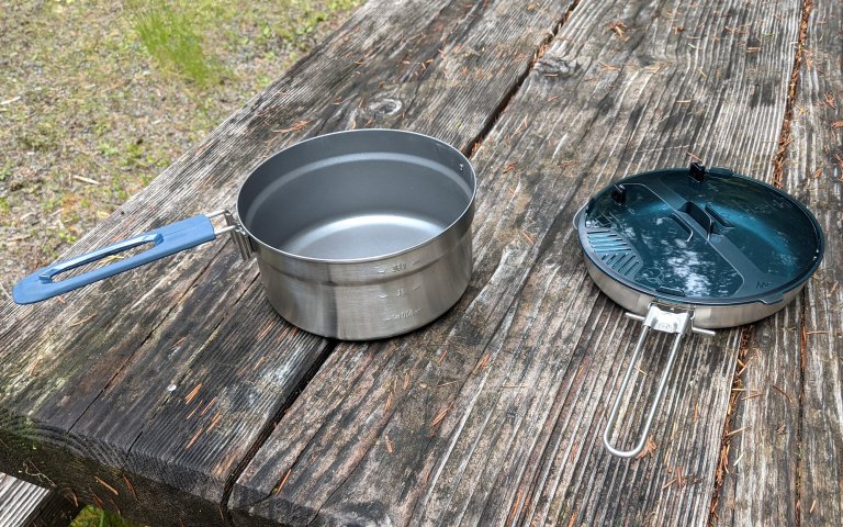 Despite its robust appearance, the aluminum construction of this set means it has some give when pressure is applied, especially compared to the stainless steel pots in my test. I wouldn’t sit on my pack if this was inside. But this slight tradeoff in durability is more than compensated for by its weight. This set is so light that I wouldn’t hesitate to take it on short backpacking trips where I’m planning to do some real cooking.