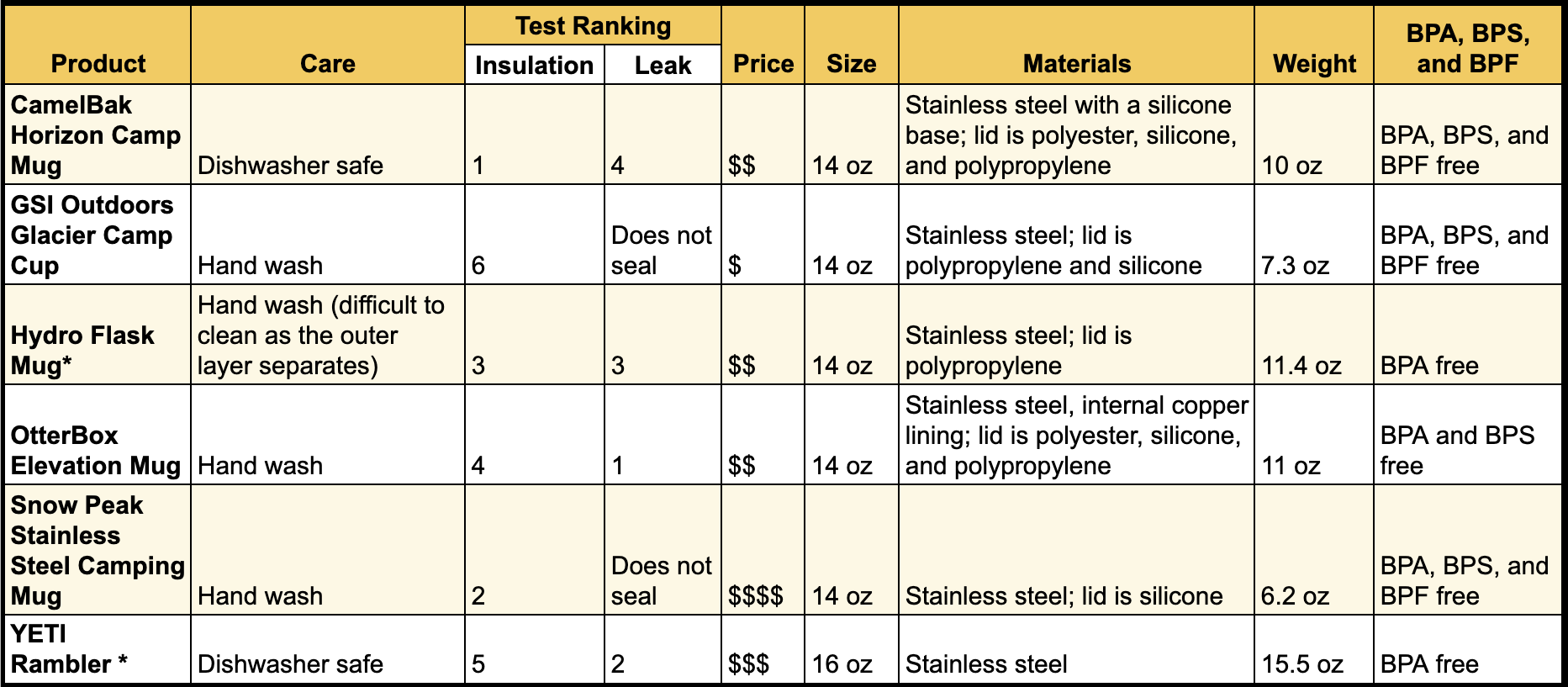 Finally, I confirmed with each manufacturer the material used in the camping mug, as well as whether these materials were BPA, BPF, and BPS free.