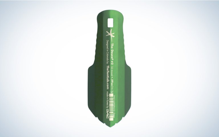 TheTentLab The Deuce #2 is a favorite among my thru-hiker testers. The Deuce #2 is one of lightest camping shovels out there and has multiple functions and abilities. The minimal weight of 0.6 ounces makes this a no-brainer carry for those who want to travel light. Made of tough 7075-T6 aluminum, the handle end is meant to pry up rocks and cut into the ground to create a hole. Then flip it and use the larger rounded shovel end to lift up the dirt in the hole. If you encounter tough ground, the Deuce has two etched teeth on either side. These are made to last a lifetime, but if you don’t want it anymore, it is 100 percent recyclable. Designed and made in Colorado.