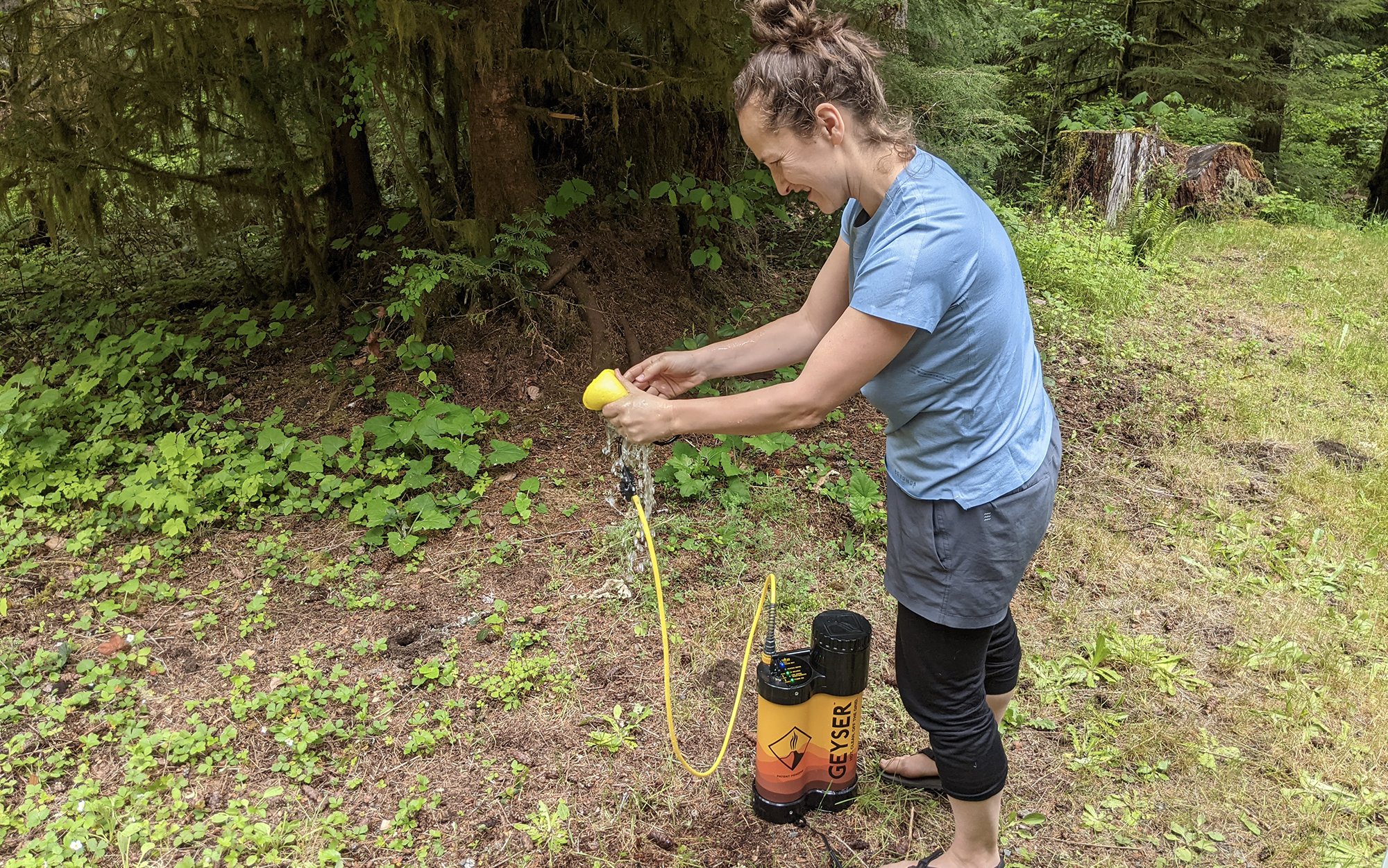Unlike the Kakadu, this one powered up just fine using my Bluetti AC60 (it could also be plugged directly into a car). The labels were clear and easy to read, so I always knew what the device was up to at any given point in time. Whereas my pick for best glamping is directly heating up water as it passes through the system, the Geyser is heating up a fixed amount of water, sort of like a tea kettle. Once you’ve used up that amount of water, that’s it: you’ll have to add fresh water and wait for the unit to heat back up again (about twenty minutes) to continue. To help reduce the amount of water you’re consuming, the Geyser only lets out a small stream at a time, and attaches directly to a sponge.