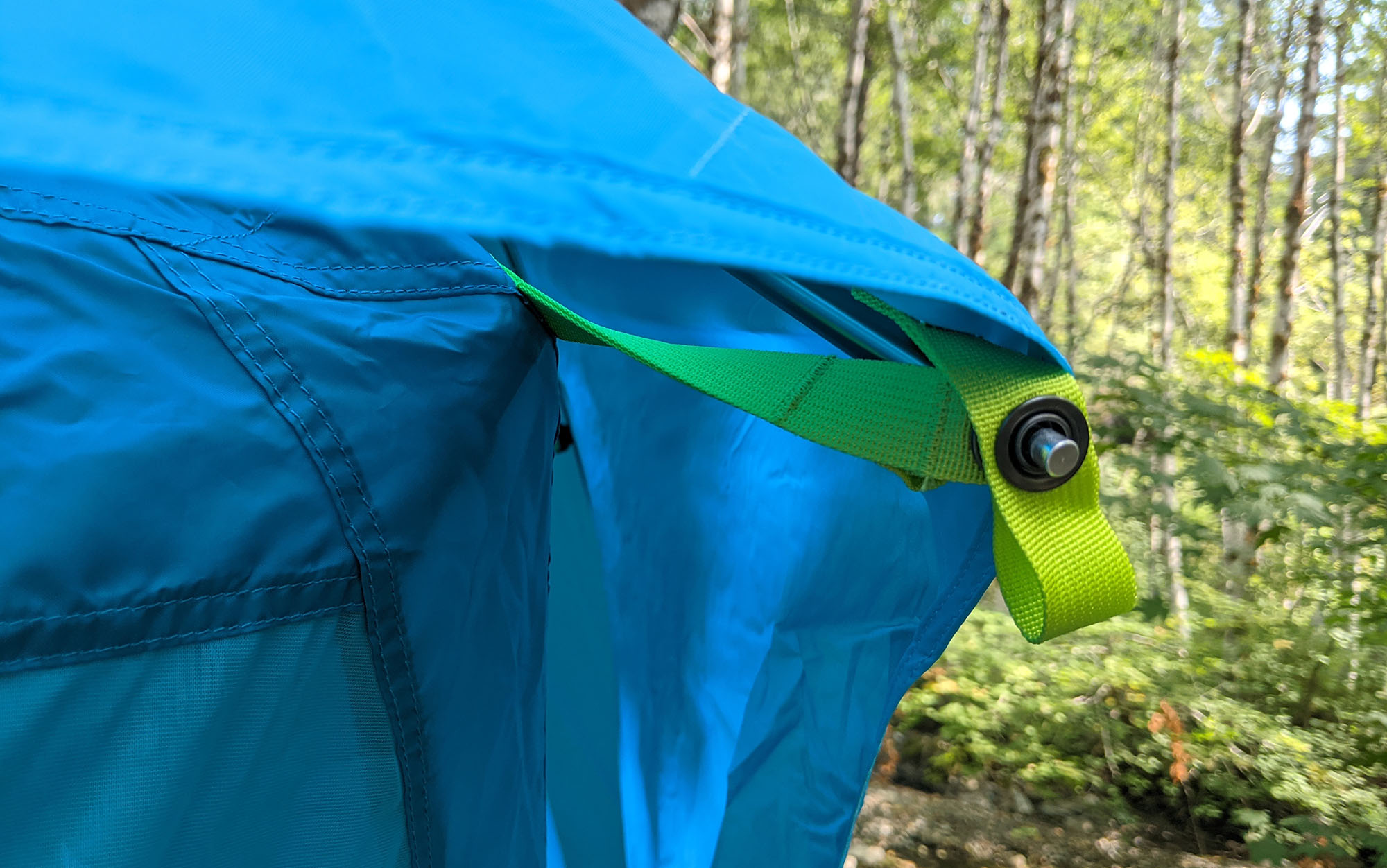 If there was one spot I struggled with this tent, it was in setting up the rainfly. The cut is unusual, as camping tents go, and it took me a bit of time to orient myself to it. But once I had it on straight, it was easy enough to clip in and secure the final pole.