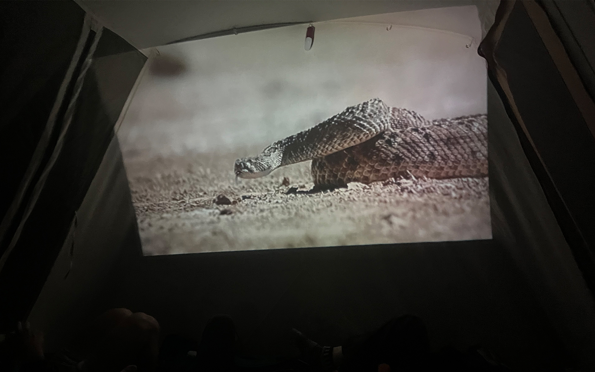 The inside of the tent is spacious and tall. I’ve spent the night in this tent comfortably with two, three, and four people. During a mid-day hail storm, six of us napped inside without issue. And I’ve spent two rainy evenings with seven people inside watching a movie we projected on the conveniently white canvas. The fact that an entire group can comfortably relax inside this tent is one of its major advantages. Whether it’s raining, buggy, or cold, there’s a cozy shelter ready to bring the group together.