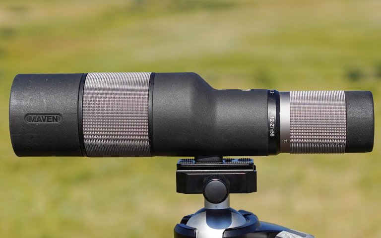 One of the shortcomings of compact spotters with angled eyepieces is that they don’t normally rotate. That means that you can’t change the orientation of the optic to your eye, a major hindrance if you’re glassing from a window mount or trying to share the optic with a partner on a sidehill. Happily, the straight-barrel Maven doesn’t have that problem. What you see, literally, is what you get with the design.