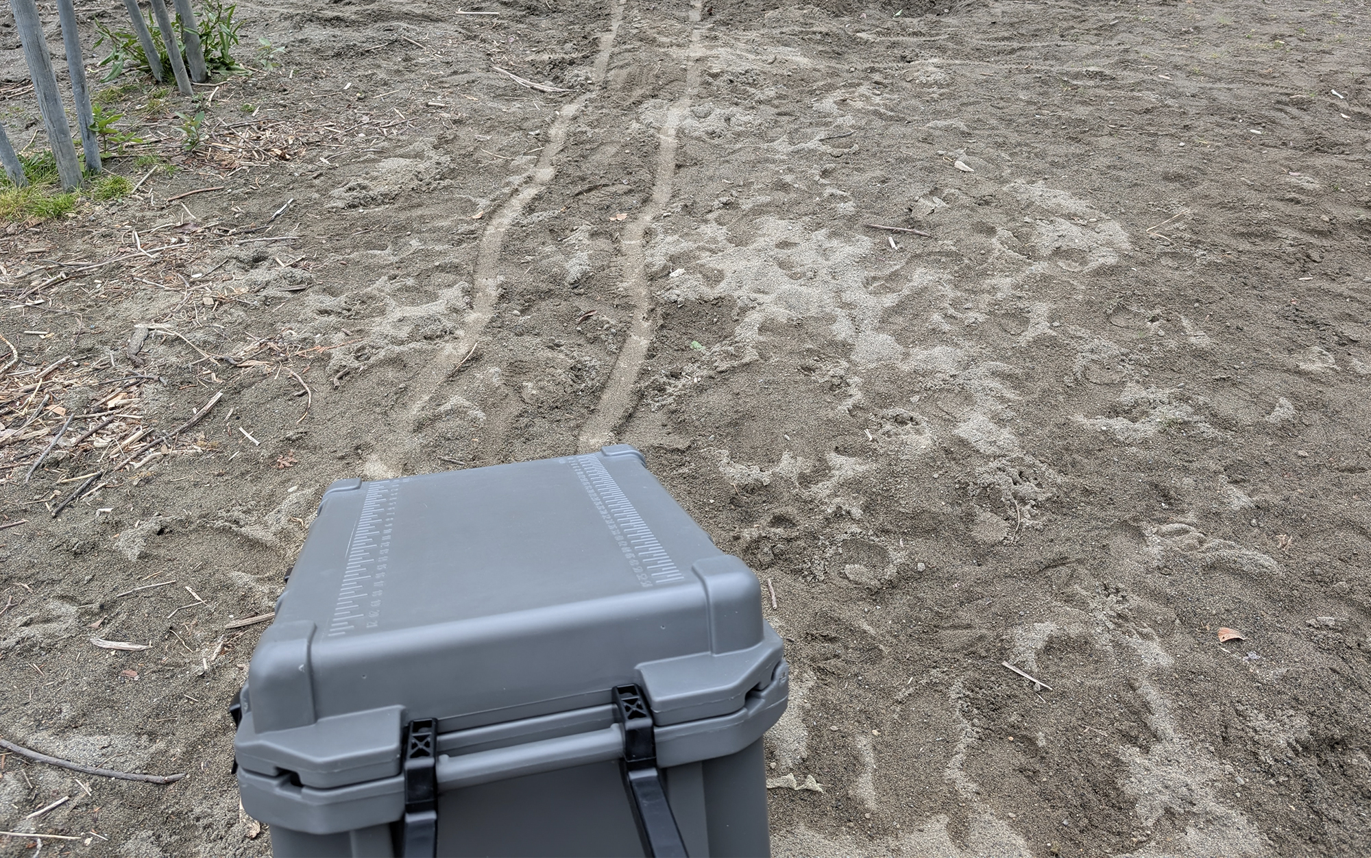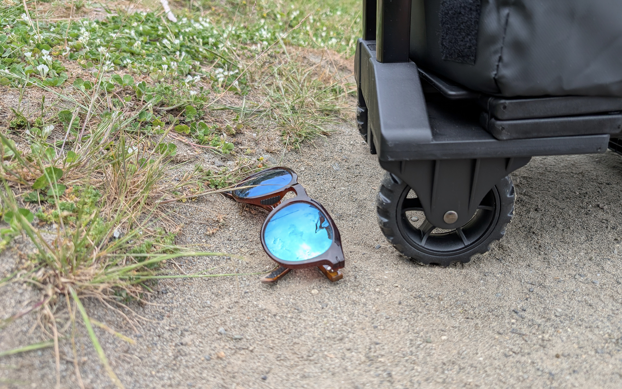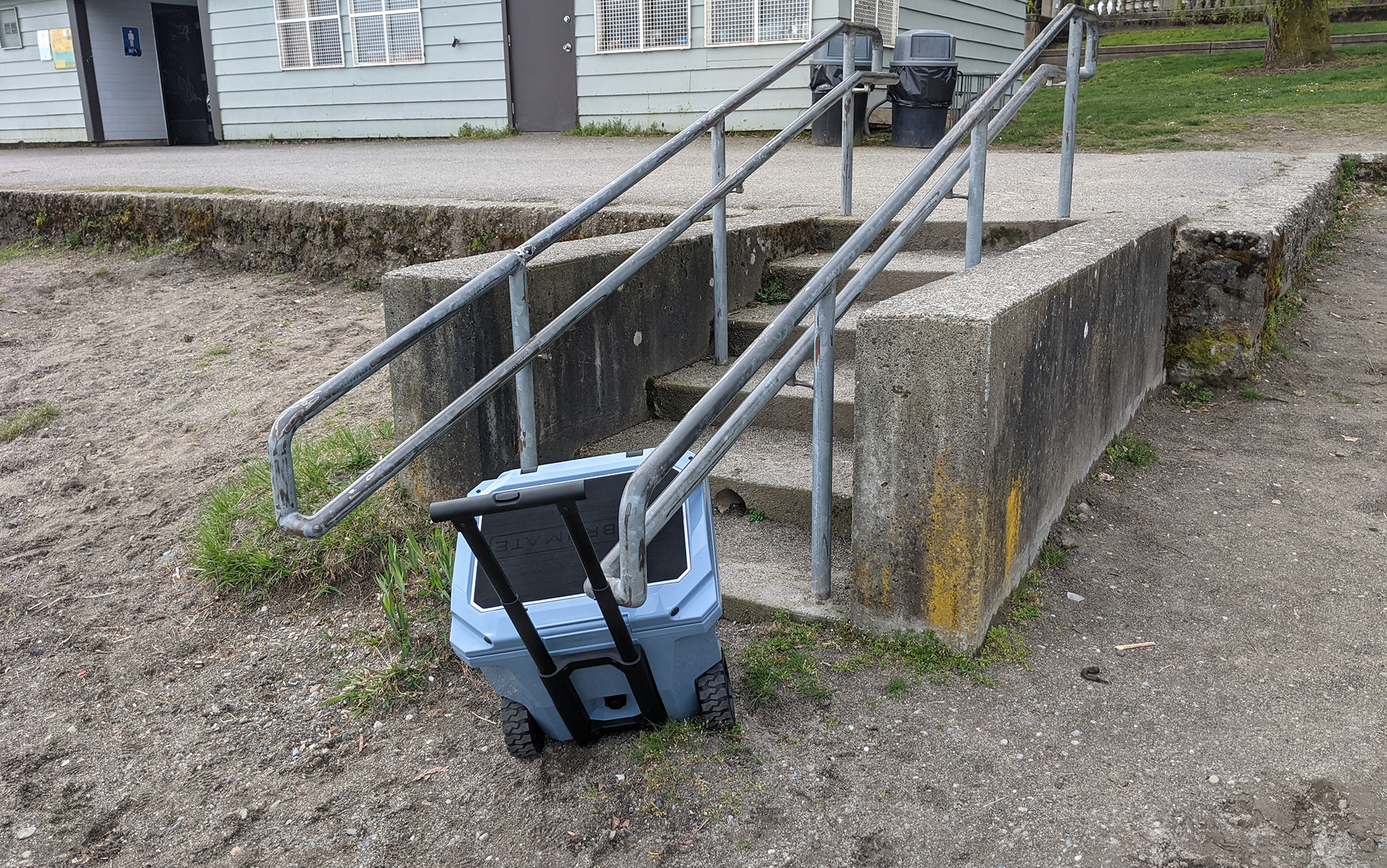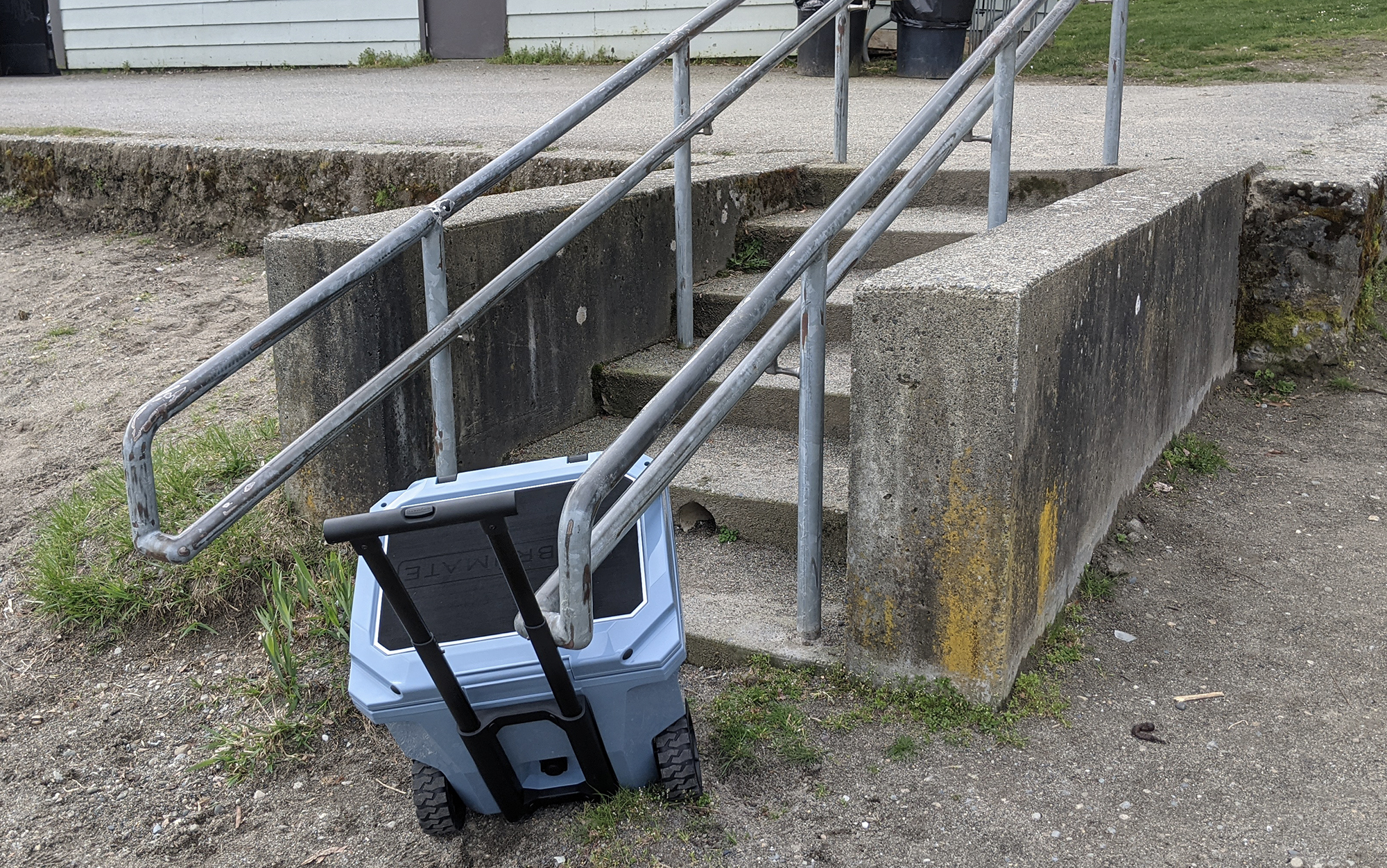 Next I looked at portability — this thing has wheels, after all. In this test, I pulled each cooler around a small circuit with a few different surfaces: a parking lot, a muddy field, a sandy beach, and down a set of stairs. I looked at both how much effort I needed to use to move the cooler over the different surfaces, how easily they got stuck, and whether I was forced into an uncomfortable posture. I rolled the coolers with 7 pounds of ice or water inside (depending on where the cooler was at in my ice retention test).