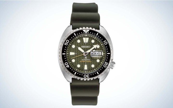 The SRPE05 takes the iconic Turtle design and makes some significant upgrades. The upgrades include a sapphire crystal, ceramic bezel, and an improved bezel action. It also sports a waffle dial design. You get all that and SEIKO’s legendary durability in a sub-$500 watch.