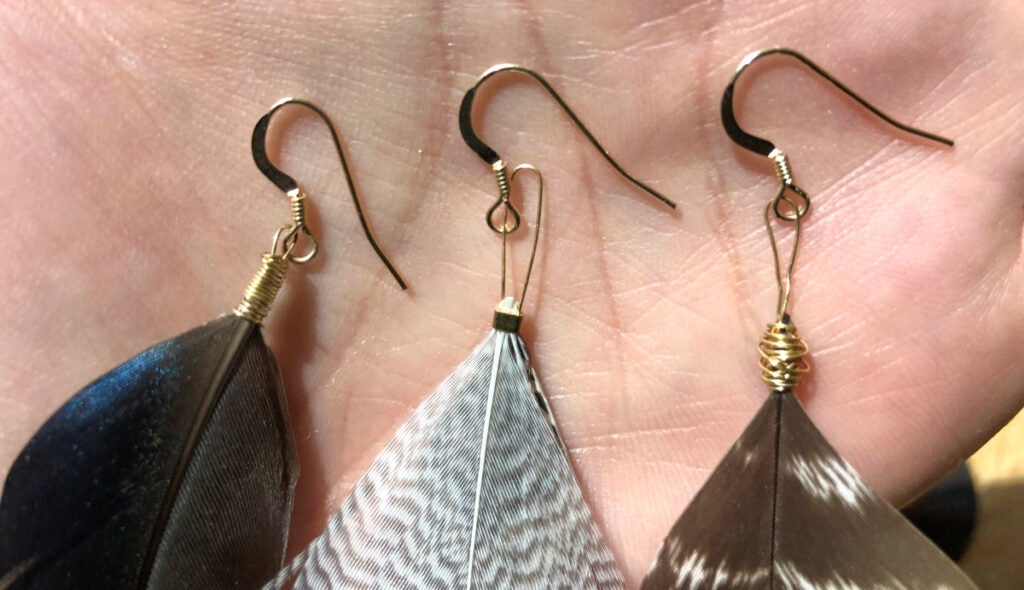 It’s turkey season now, so tag out quick or pluck a few from a buddy’s bird. Even better? Secretly snag some from the longbeard your mom killed. If you’re a fly tier or a feather hoarder like me, you can use feathers from ducks, pheasants, grouse—whatever’s available. (My two favorite pairs are made from drake mallard curls and mallard speculum feathers.) If you do have the necessary materials lying around, this project won’t cost a dime. Scrounge earring hooks from an old pair, or buy new sets online or at a craft store.