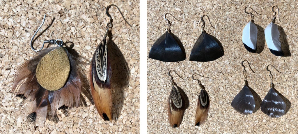 If you want to get fancy, you can shape feathers with a fine pair of scissors. Just keep in mind that the feathers are very light, and have a tendency to fly up in wind or when walking, so it’s not a bad idea to add a little weight to the back of the feather, either with a bead or a small patch of leather. If you want to make earrings from wing feathers, be sure to take similar sized feathers from each wing so they’re symmetrical. —Natalie Krebs