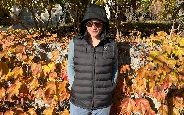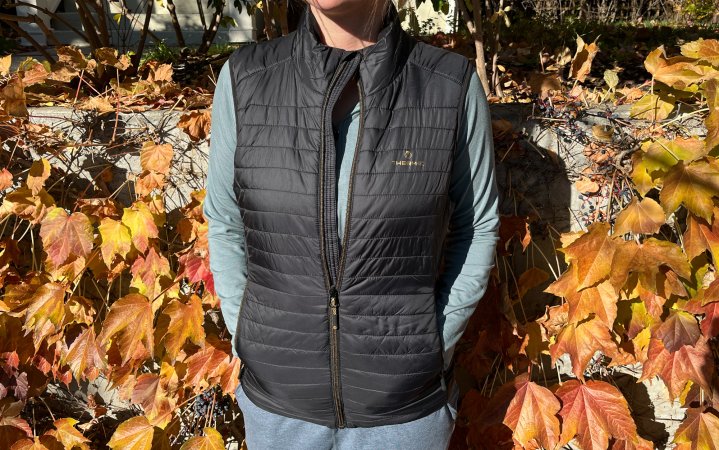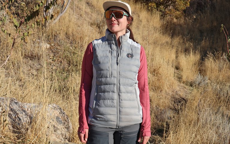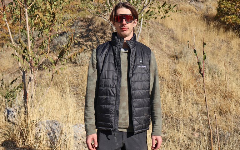 The upgraded Venustas vest has a long battery life thanks to a sizable battery. It stayed on for over 5 hours on the highest setting. This quilted vest traps heat and layers well for frontcountry excursions or sitting by the fire.