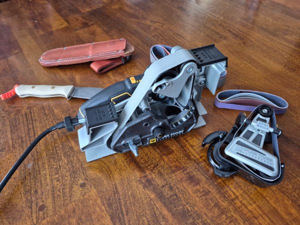 The NuoDunco 3-in-1 Belt Sander was most likely not designed originally as a knife sharpener, but it sure does a nice job sharpening knives. When I saw some of the aggressive belts that it came with, I decided to rehab a beat up old serrated bread knife with it. The serrations were toast, and it had a completely unsharpened tip. I removed all the serrations and ground down the tip to be even with the rest of the blade. After the shaping was done, I ran it through the finer grits, then finished on the buffing wheel for a semi-polished edge that was quite sharp.