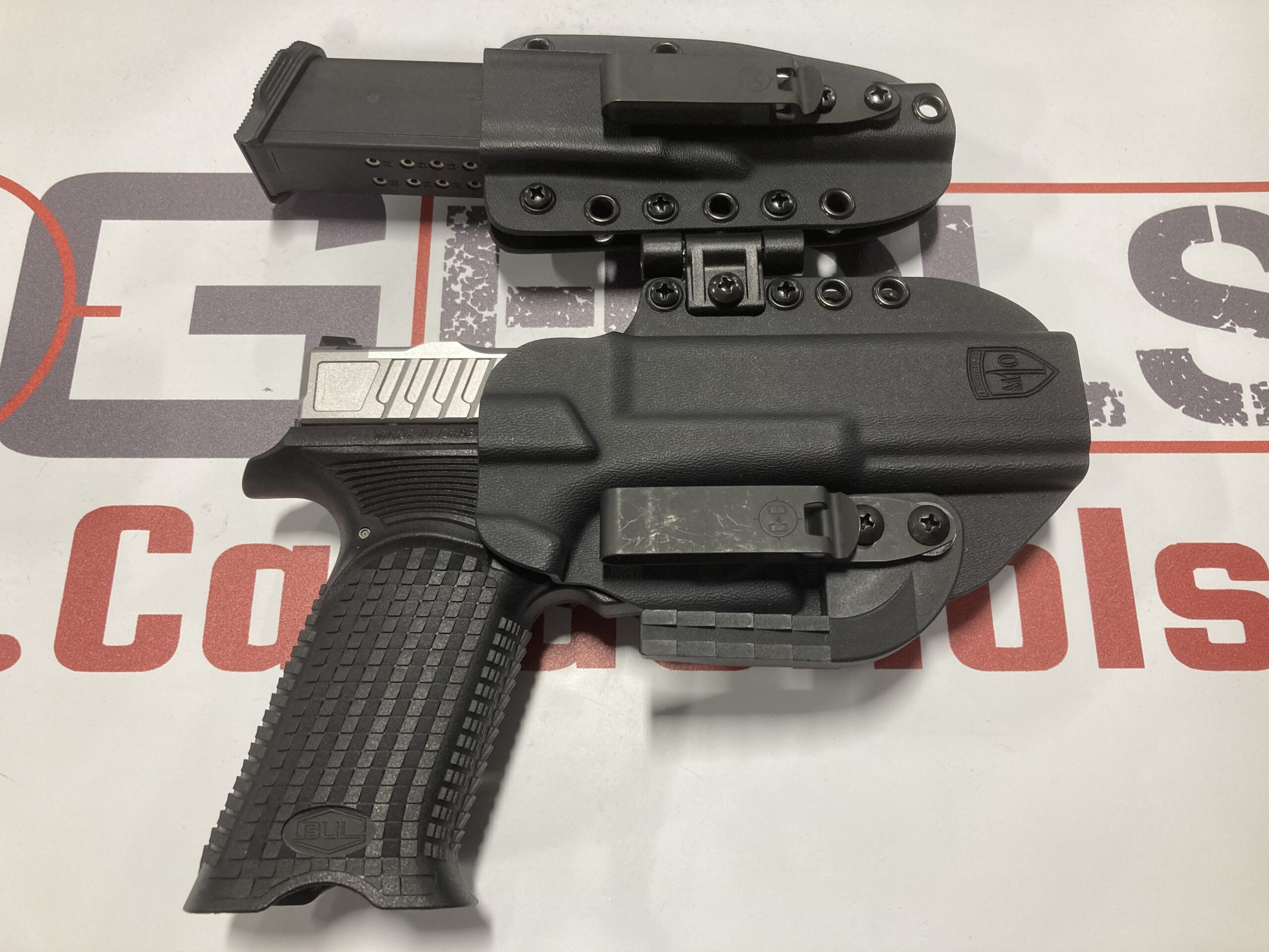 I tried the Covert with a Bul Armory Axe and was extremely impressed with its ability to carry and conceal a gun of this size and weight. The Bul Armory Axe runs on the larger side of guns (Glock 17 size), and the Covert made the size and weight nearly disappear under my untucked shirt. I have issues with other holster claws not gripping the belt securely but had no issues with the claw on the Covert.