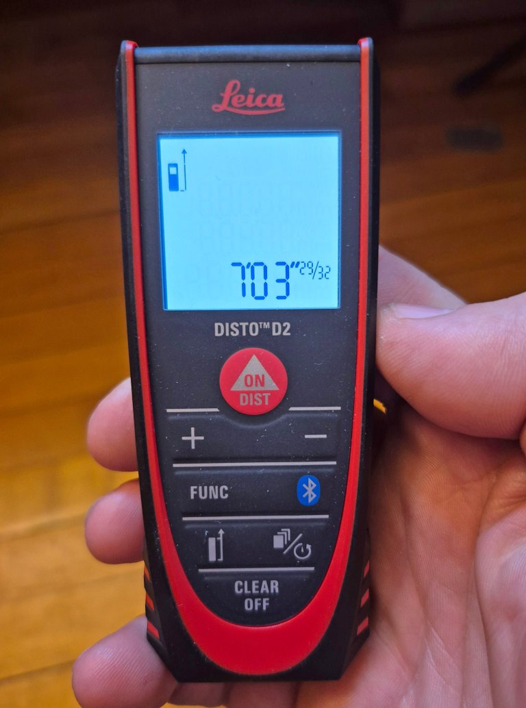 Of course, the primary function of these tools is to find a distance, and the DISTO D2 gave very fast and accurate measurements from any position. There is a tab that folds out on the bottom at 90 degrees so that you can “hook” it on boards or corners and shoot the distance without trying to line it up, and that same tab folds straight back so that you can put it in an interior corner or other tight spot for an accurate distance or if you are measuring to find square.