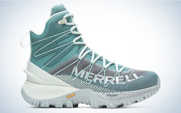 Not only was the Merrell Thermo Rogue the lightest option I looked at for my test of the best winter hiking boots—at about two pounds for a pair, it also performed impressively during most of my testing protocol. Like the Danner Arctic 600 and the Oboz Bangtail, it sports a variation of the Vibram Arctic Grip and was pretty grippy when walking on ice. I had to step more carefully than with the other two boots, but I would be confident walking on most level icy surfaces with the Merrell Thermo Rogue. It also handled the waterproofing test admirably, staying dry for 14 hours when left in standing water.