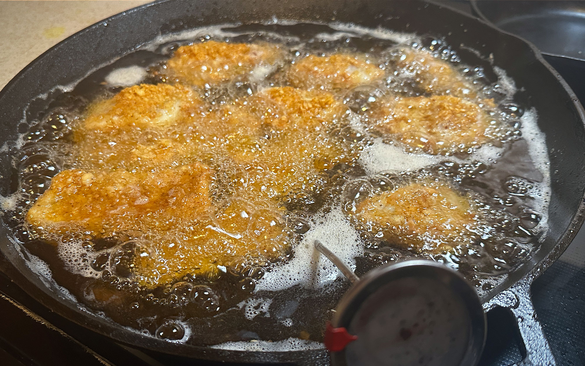 Propane fryers heat up quickly but cannot be used indoors because of carbon monoxide risks. Electric-powered fryers can be used either inside or outside. Traditional, pan-frying in a cast iron skillet on a stove, fire grate, or portable propane burner, can work inside or outside. Air fryers, which don’t require oil, need an electrical source.