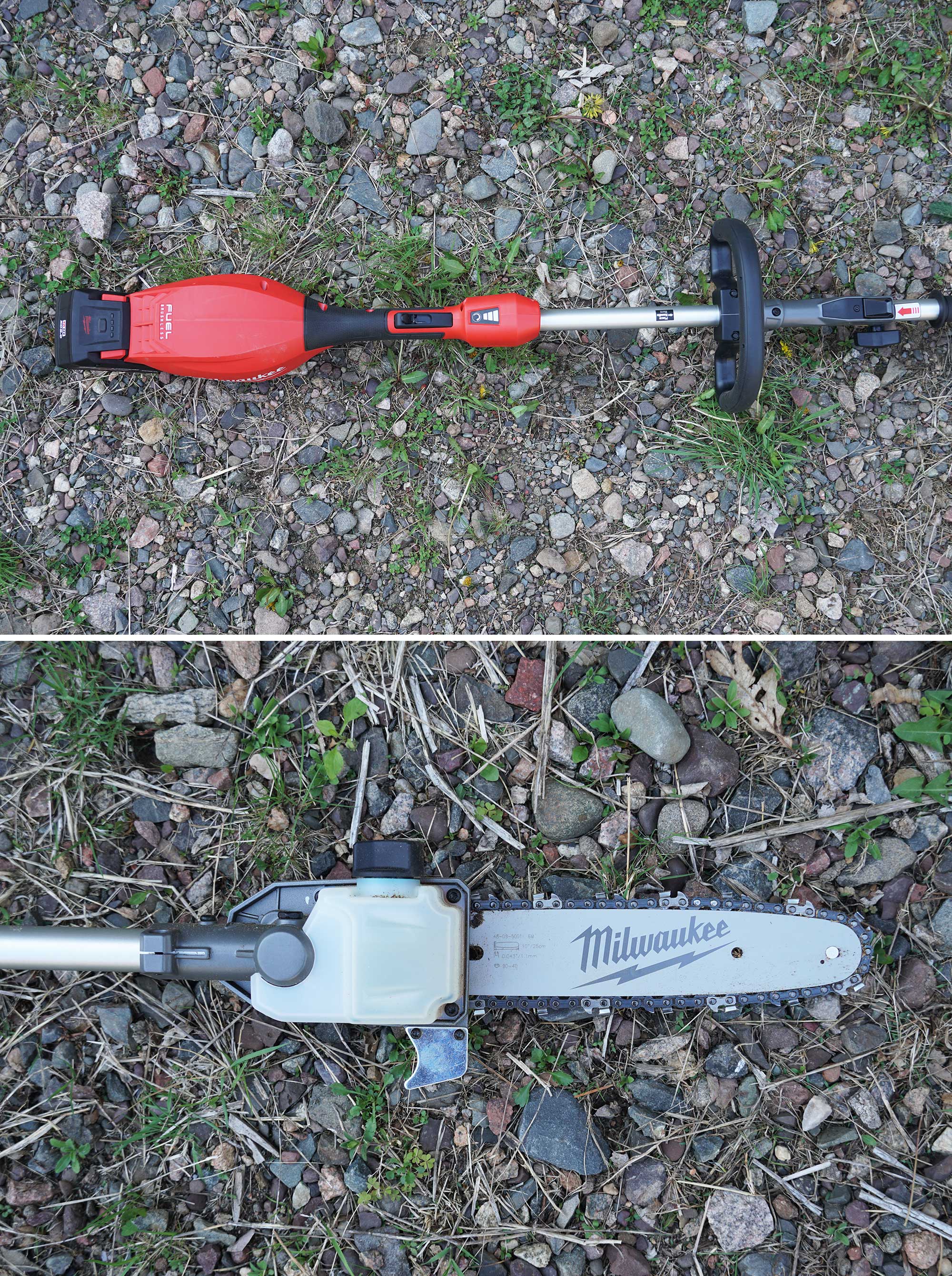 The coolest thing about the Milwaukee pole saw is the ingenious “Quik-Lok” environment in which it lives. In this package, Milwaukee essentially gives you a powerhead and shaft that can connect to 13 different attachments — ranging from a string trimmer, to leaf blower, to brush cutter. You swap between attachments by simply loosening a knob and pressing a button. No tools required.