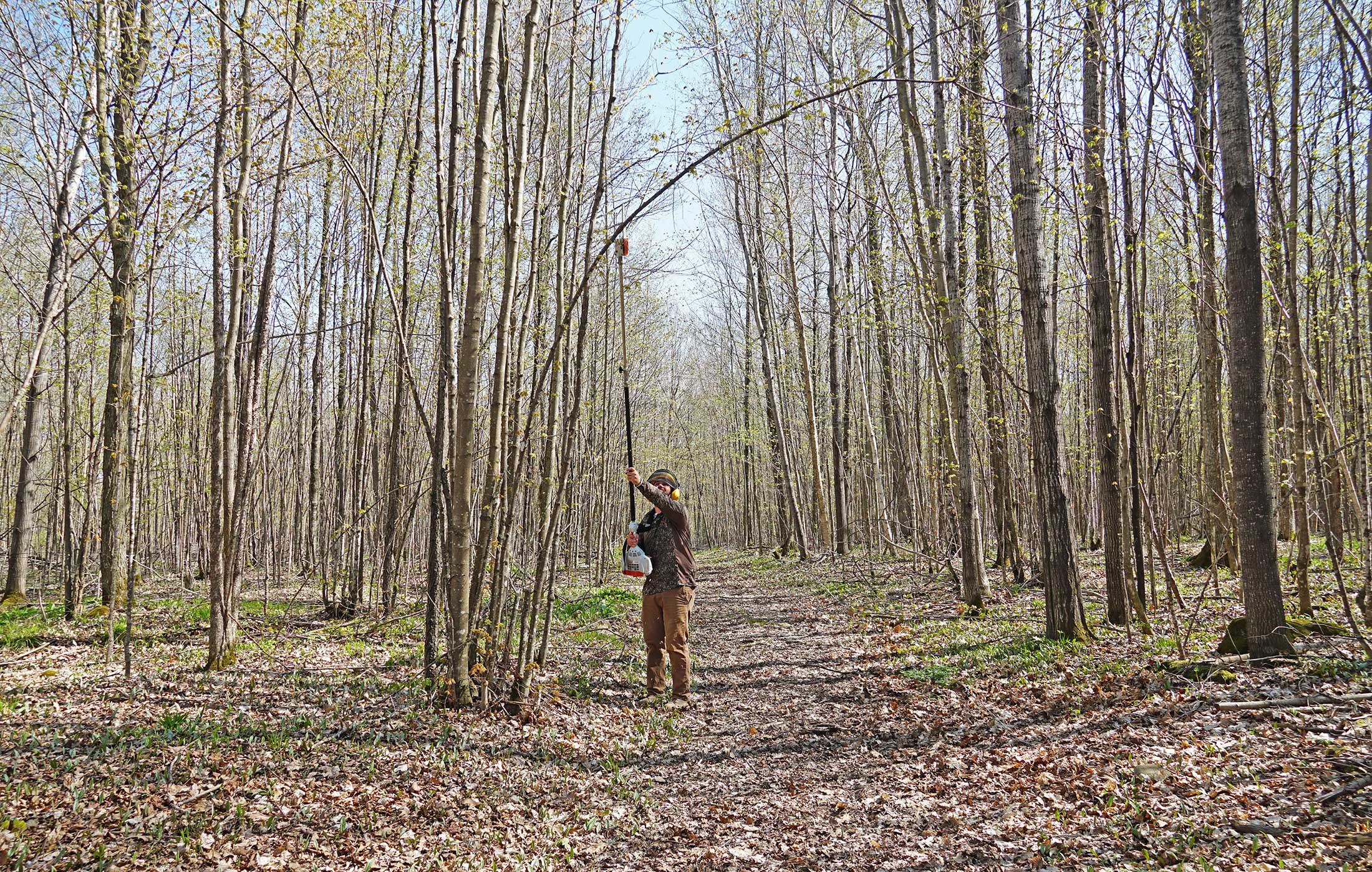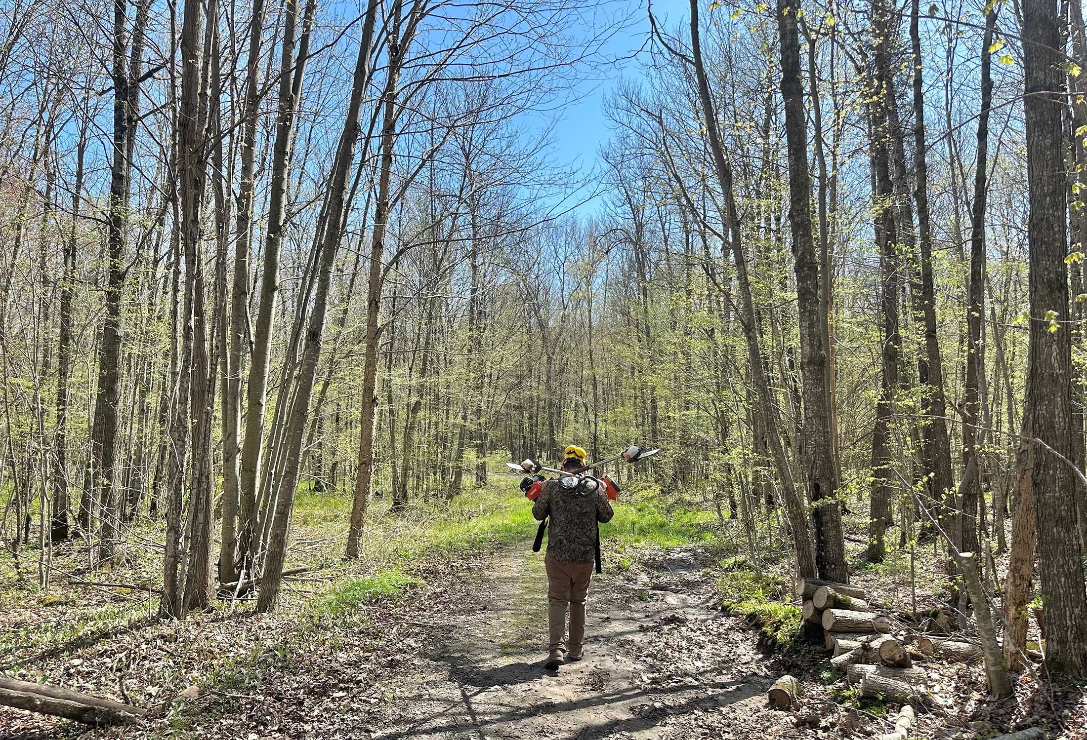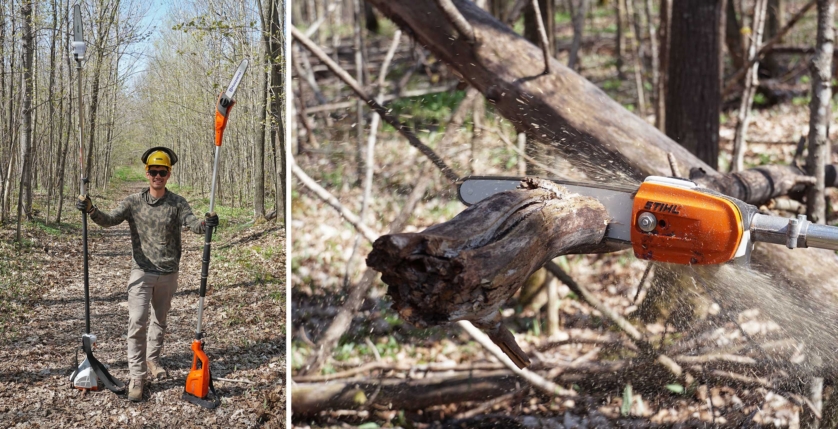 I recruited my cousin to help me test pole saws on our hunting property in northern Wisconsin. Fresh out of the box, I conducted a speed test with each saw, by running them through a 4-inch diameter oak limb. I timed how long it took each saw slice through and each got three attempts, which I averaged. The battery-powered saws with adjustable speed were tested at their highest setting.