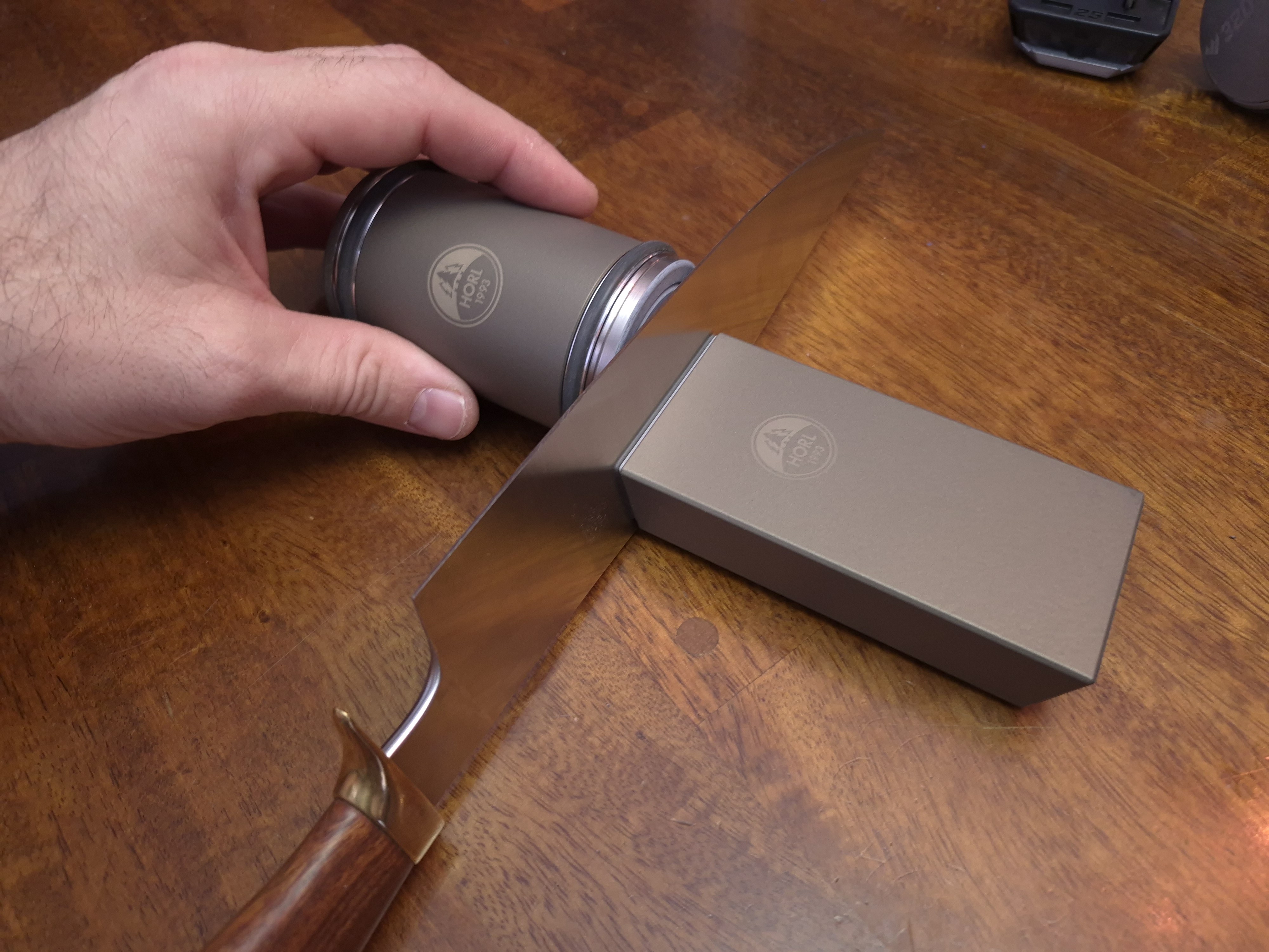 The block is limited to either 15 or 20 degrees, but those are two very common and useful angles. As for the actual sharpener, it has a solid axle connecting the two wheels, so it doesn’t turn well, but it rides on ball bearings and does roll very smoothly. The discs are diamond coated on both sides to extend service life, but you will need the included tool to pry them off. The magnets are strong, and the notch is too small to get your finger into. The 400-grit disc is fine unless you have some chips that you want to fully remove, which will take considerable time as it is not very aggressive. Once you get a burr on both sides of the blade, you can move to the 1000 grit and get a great working edge on the blade. As with all of these sharpeners, a little patience in the finishing will yield the best results. If you want to be able to sharpen all your knives with a rolling sharpener, the HONE will give you the best chance to get your smallest blades sharpened up.