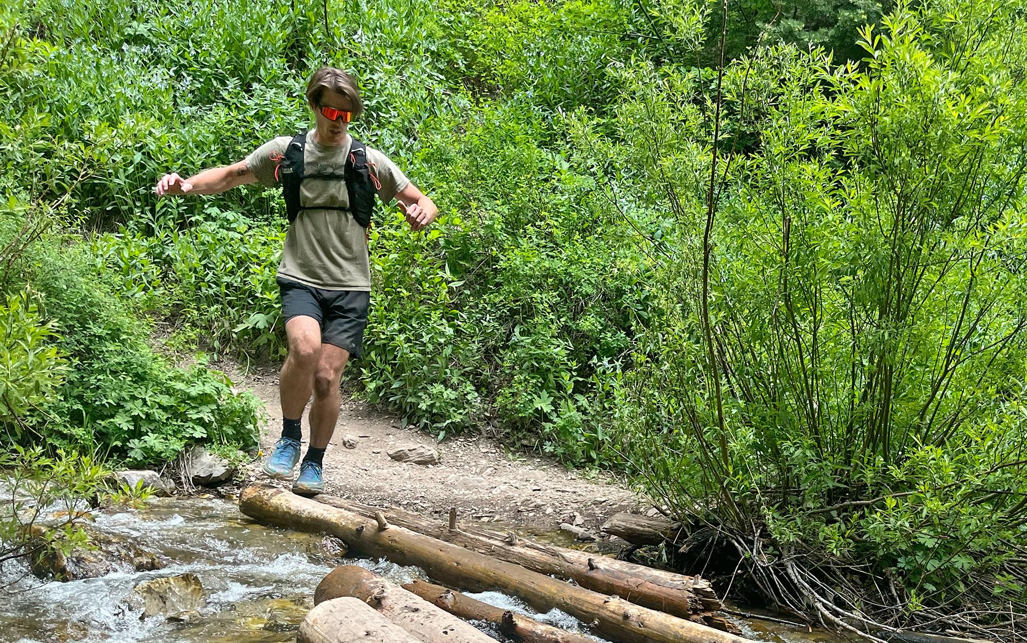 After giving up on a flopping fanny pack that threw off his pace, OL social media manager Derek Horner started leaving his phone (and tunes) at home for unencumbered runs. But The Osprey Duro 6 now gives him the space to carry water, his phone, and a small first aid kit. Horner used this vest for his daily running routine on mixed trails and pavement. He also brought it on a trip to Acadia National Park for a 5-mile run with his dog Barley.
