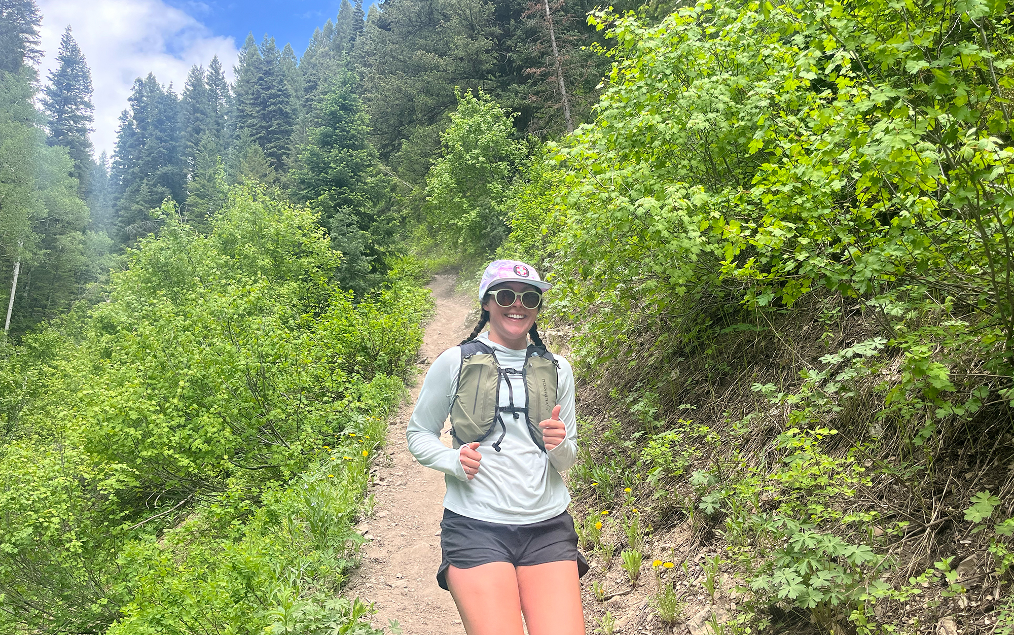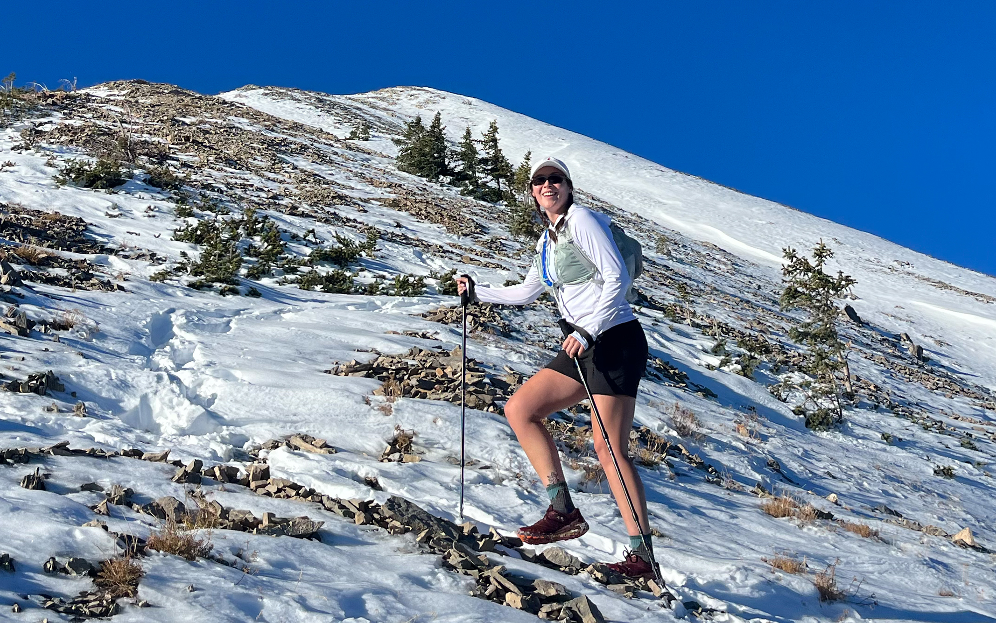 Ultimate Direction’s Xodus Vesta is great for a flexible but body-hugging fit. Hill was a big fan of the side zipper and elastic lacing for perfect fit. She says, “This vest actually molds to my body, despite having a bigger chest and a smaller waist which usually complicates running vests for me.” Hill is excited to add more layers to reduce the movement, and stow her bear spray in the convenient front pocket when she returns to Montana.