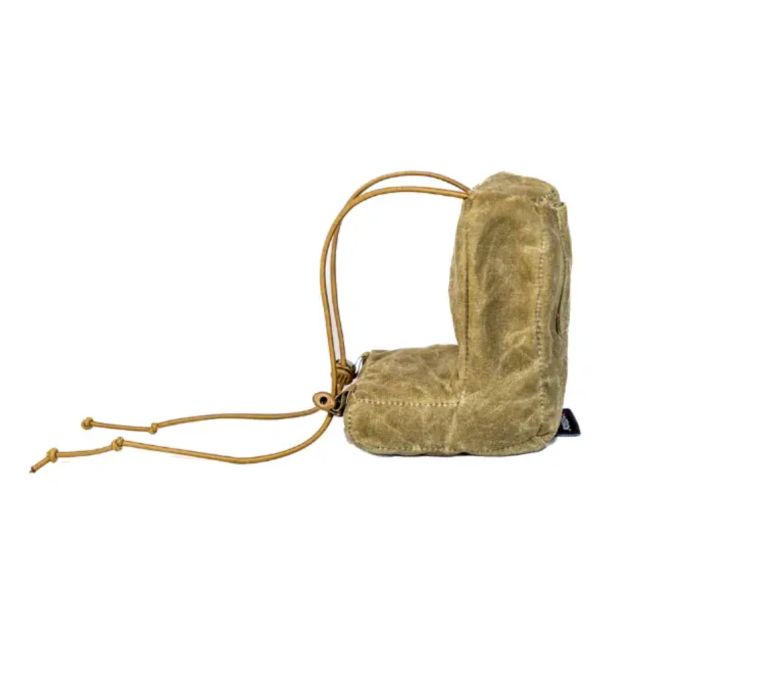 The bag is made of waxed canvas, comes in a couple different color patterns (orange/brown and brown/brown), and has a no-leak loading port that seals with Velcro that can be used to customize the quantity of fill.