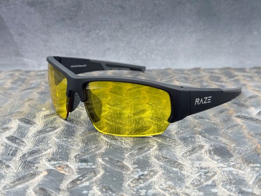 The B-Raze from Hunters HD Gold is a light and low-profile set of shooting glasses that combine excellent lenses with a strong flexible wrap-around frame. Like other tactical-type glasses, these position the wrap-around lenses close to the eyes and have slender temples that fit nicely under over-ear muffs.