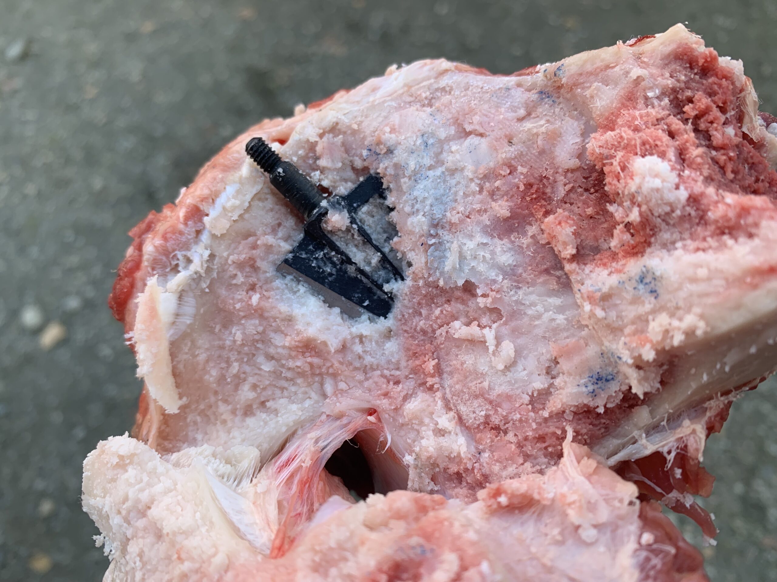 Bonehead broadheads come razor sharp, treated with oil, and with the edges protected by a removable dip plastic coating. If you choose the 1075 steel, make sure to keep the edges oiled in your quiver, and they will serve you well. Overall, it’s an excellent quality head, and the only obvious weak spot is the weld between the ferrule and blade. When shooting the moose bones, the point buried into the bone, but the weld snapped, sending the ferrule-tipped arrow back away from the target. When I recovered the point, the tip was curled over dramatically. This was an abusive test that wouldn’t dissuade me from using these points, but i’d be more careful about shot placement.