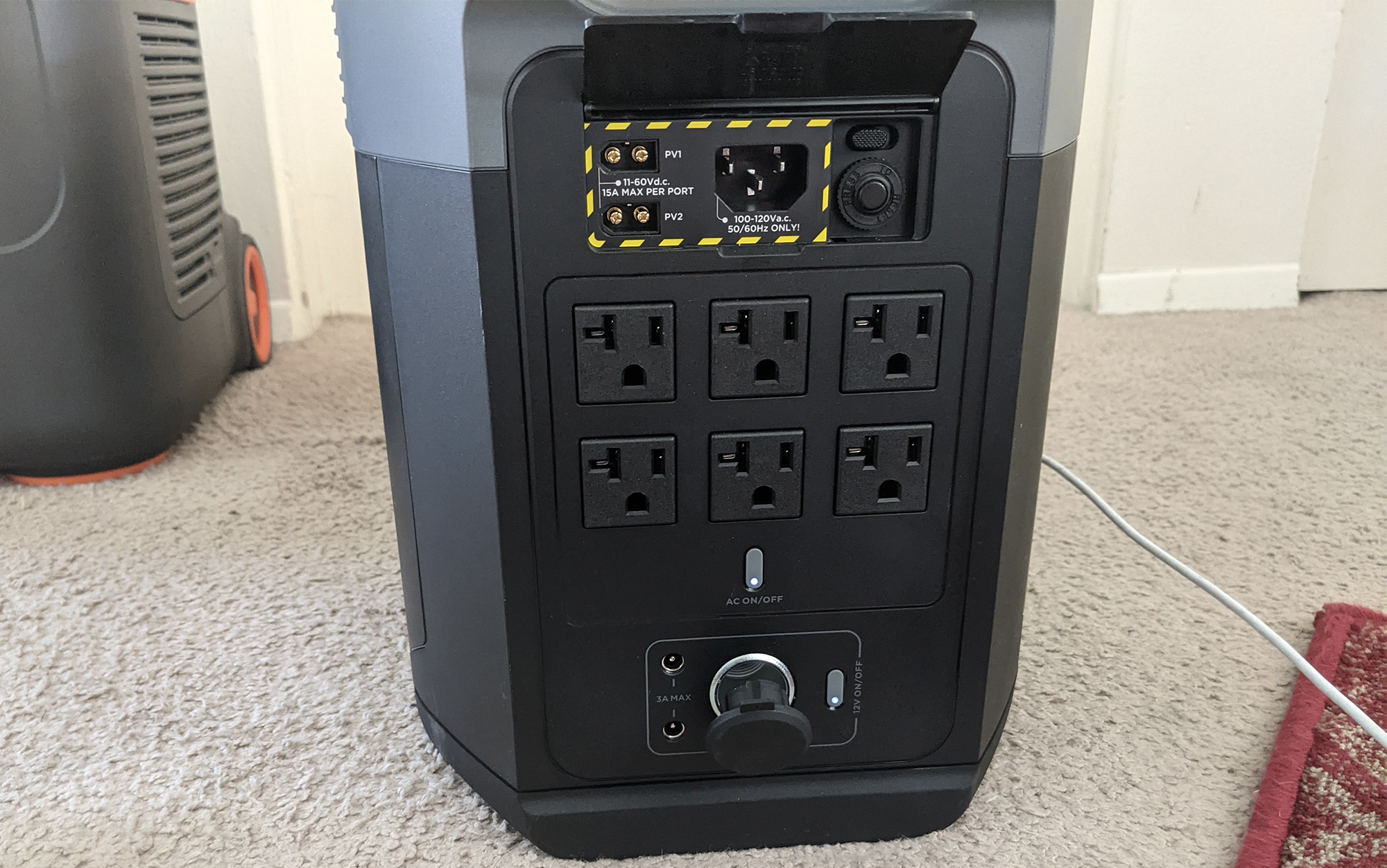 Something different about the EcoFlow Delta 2 Max compared to other power stations I’ve looked at is that the six AC outlets (as well as the car outlet) are on the back side of the power station, with the solar and AC input ports. This can be a bit of a chore if you plan to swap out cords on a regular basis, but if you’re setting up a static off-grid system that you won’t be fiddling with too much, it has a nicer aesthetic.