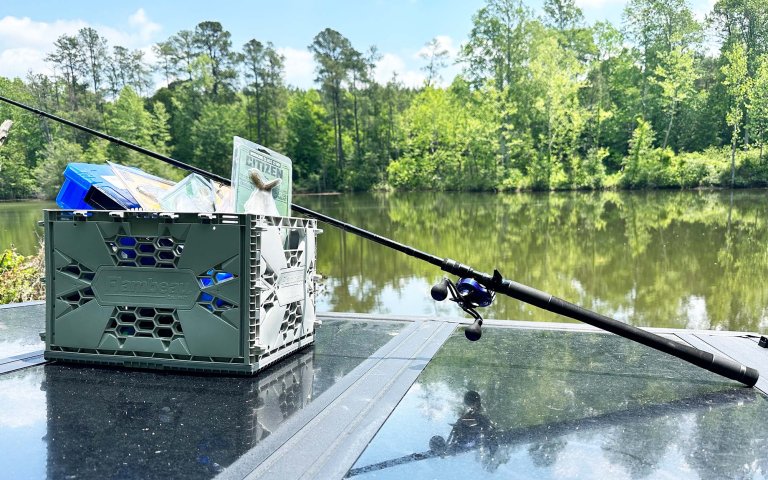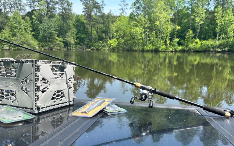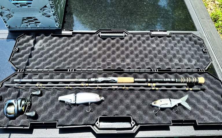 I keep this rod, a Shimano Curado DC 200, a K9 and a Chad Shad in my truck at all times. That killer combo has opened up a lot of fishing opportunities for me — especially in urban ponds. The rod sections are 2 feet 7.5 inches long so they can stuff into a checked bag or carried on a plane in a rod tube. Just note that big trebles are hit or miss on making it through TSA in a carry on bag.