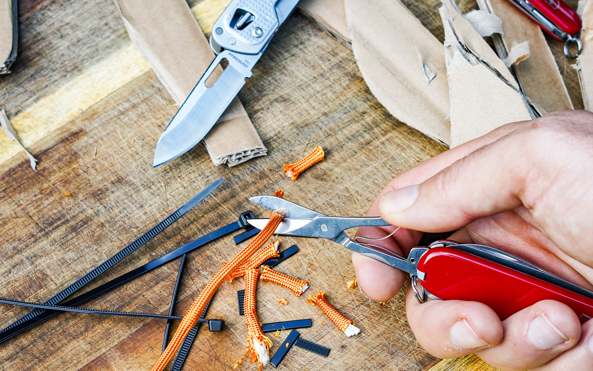 For the three SAKs and the alternatives I tested, I used every function the tools had to see how they performed: I cut wire ties, paper, and 550 cord with scissors. I carved wood and cut cardboard with the knives. I turned screws with the screwdrivers. You get the idea.