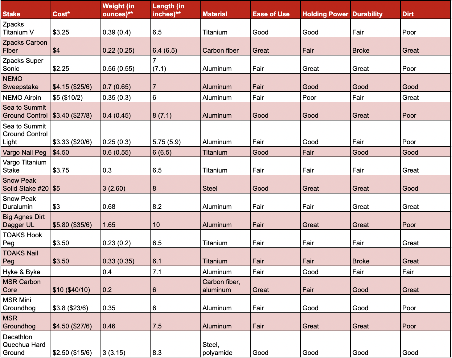 Half an ounce give or take may seem insignificant to all but the most dedicated gram counters, but when you need to carry six, eight, ten of an item, it starts to add up. Sticking with aluminum or titanium stakes is a smart choice for most backpackers looking to save weight without sacrificing performance.