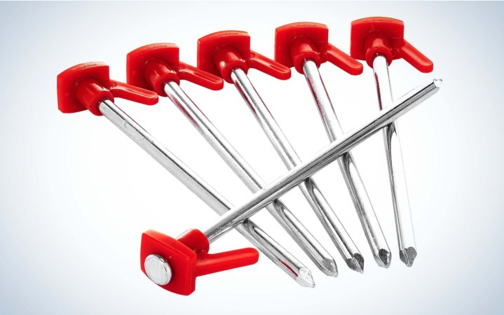 During testing, the Snow Peak Solid Stake #20 and Decathlon Quechua Hard Ground were neck-in-neck for best car camping tent stake. They were both made from steel and about eight inches long, providing excellent durability and holding power. They also held onto little dirt given their cylindrical design. But the Decathlon Quechua Hard Ground’s were just a hair longer, and a fair chunk less expensive, so it won my vote for the car camping slot.