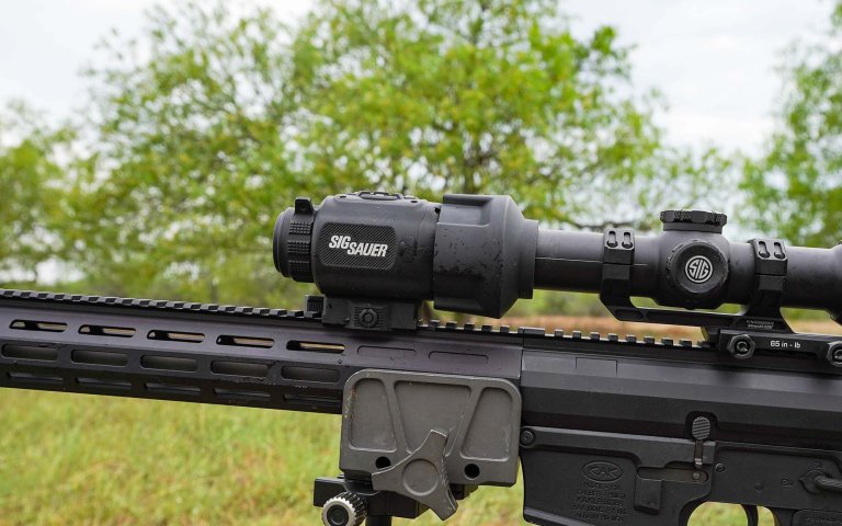 Thanks to the Sig’s integrated quick-detach rail mount that’s precisely 1.535 inches high, the unit aligns perfectly with an LPVO or similar scope with a 30mm or smaller objective lens on a standard-height unimount. But here’s the rub. The two optics nest together so tightly that you may need to adjust the scope inside its mount in order to ensure that no ambient light gets between the slave scope and the thermal.