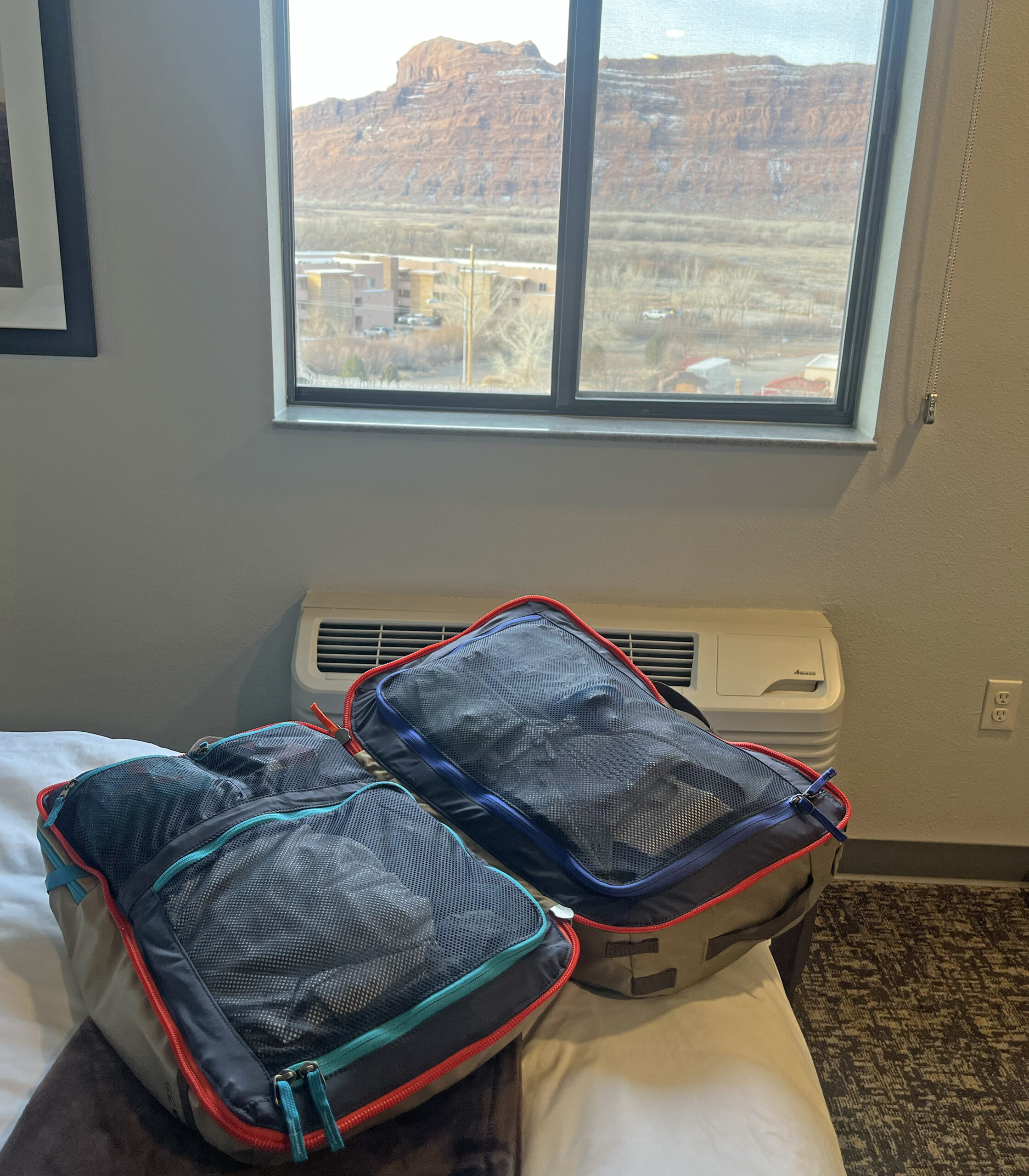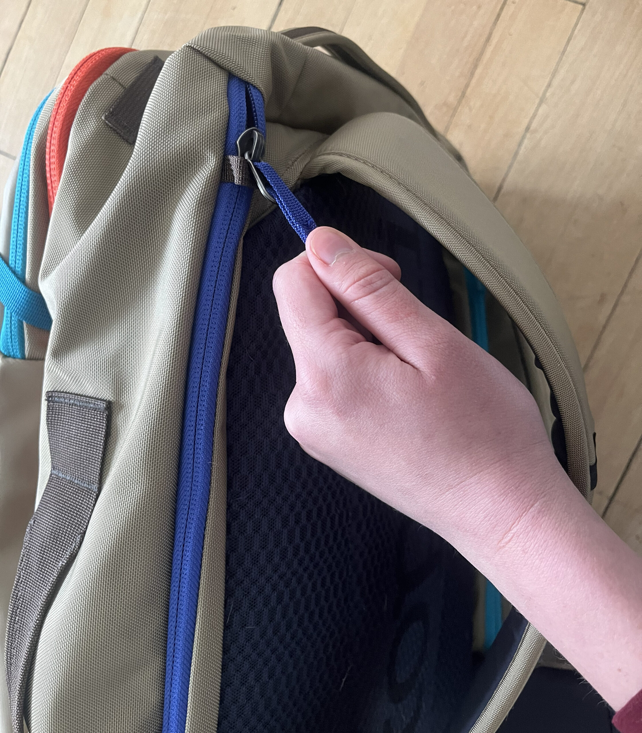 The Cotopaxi Allpa can be carried on your back or via one of the four handheld straps on all sides of the bag. These handheld straps are great for yanking your bag out of a pile or down from an overhead bin. I took this bag on a three-day ski trip where I stayed in a hotel and car camped. This bag was perfect in the hotel because of the four mesh zippered compartments to keep everything organized. In the car it was a little more difficult to splay the bag out fully for access to these compartments, but there is a side zipper that allows you to dig into the largest compartment without unzipping the entire bag.