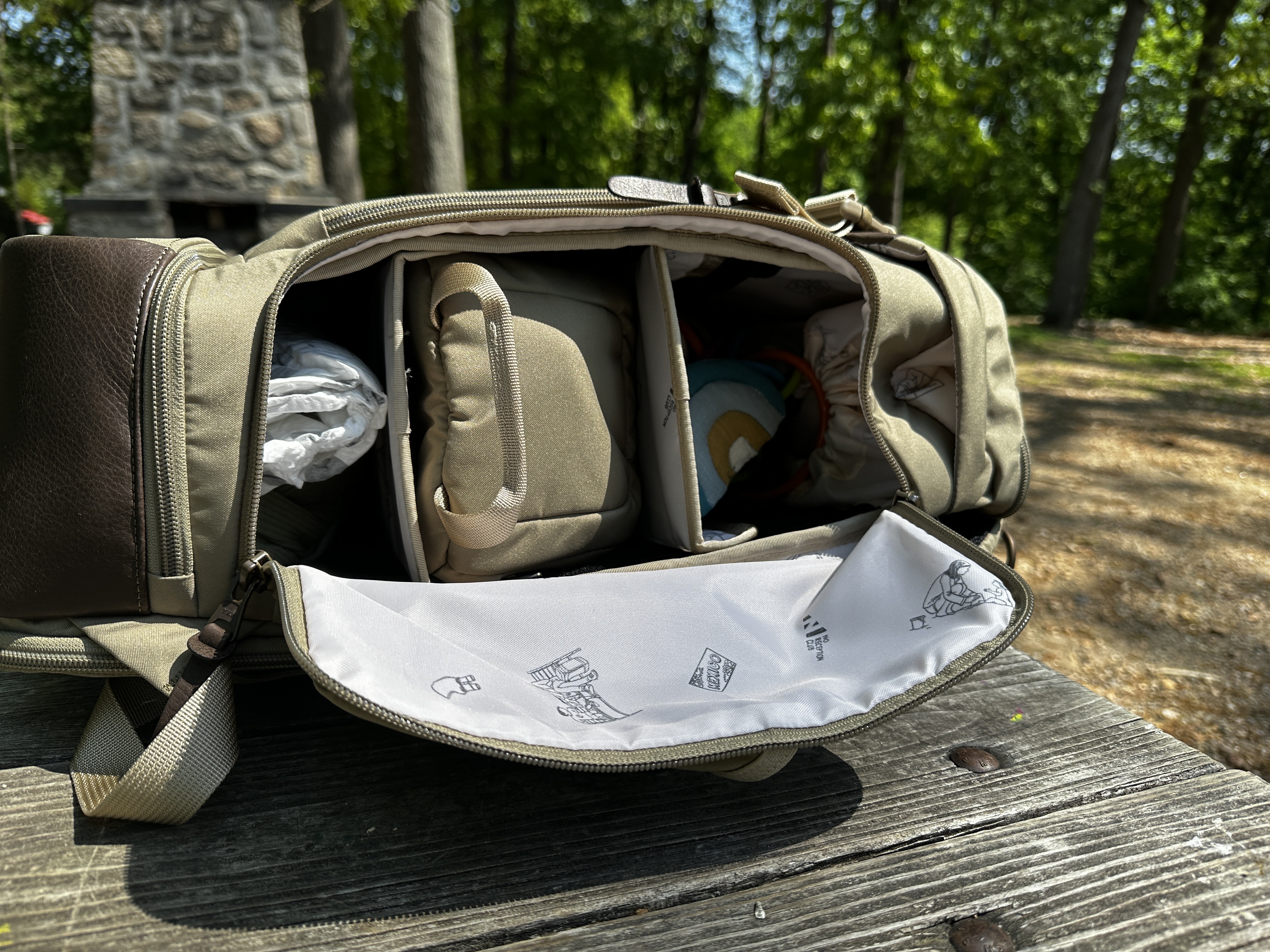 Wipes, burp cloths, and a favorite toy are in the top compartment for easy access. A blanket is in the side compartment. The back panel holds a foldable changing pad. Diapers, bottles, and more toys are in the main compartment, which is divided into three shelves. The included insulated bag fits neatly into the center shelf and it holds two Dr. Brown’s 8-ounce bottles or one bottle and an ice pack. If your child is eating solids, it will hold several jars and an ice pack.