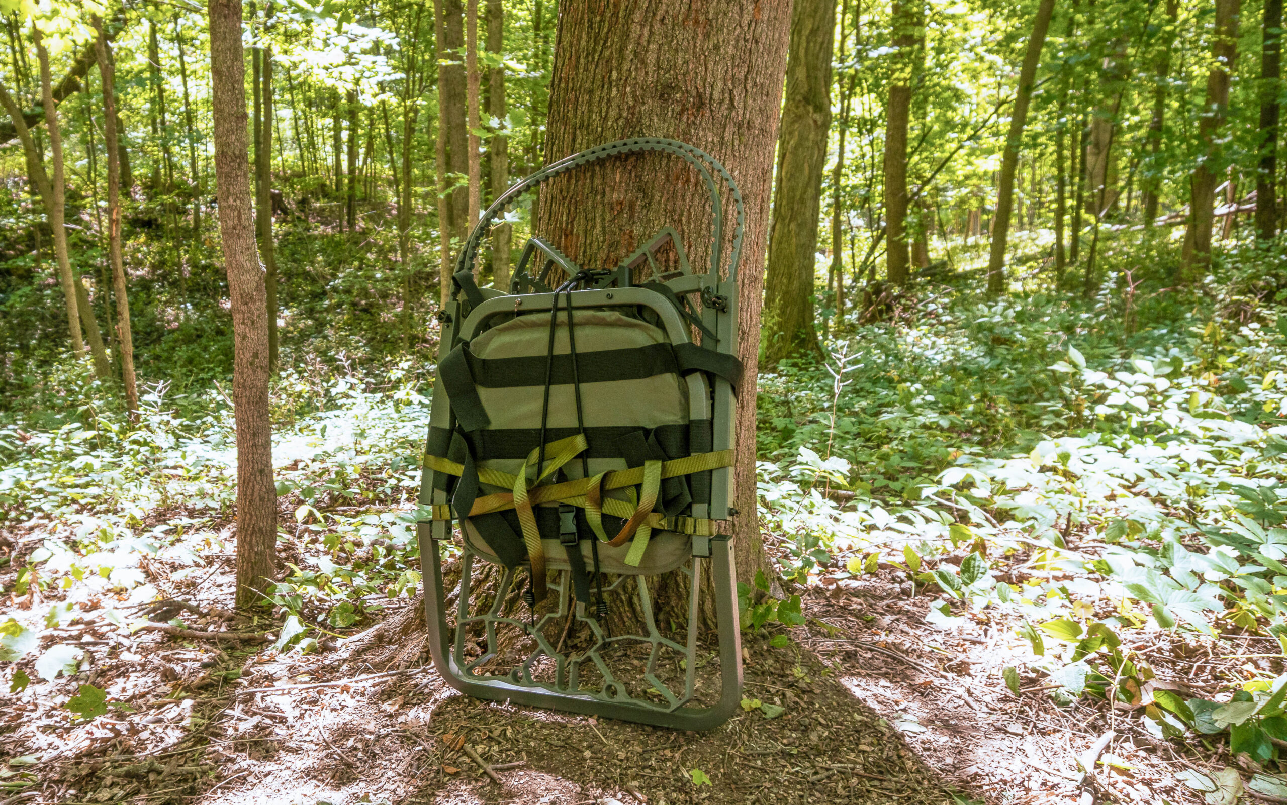 The .5 is made for mobile hunting, and it has a lot of features that make it one of the easiest to pack hang ons. The .5 was very quiet while packing or hanging it, and I especially appreciated the compact profile for sneaking through thick cover without getting hung up. I found it very easy to hang, producing the only sub-2-minute setup time of the test. The Lone Wolf Custom Gear climbing sticks securely lock into place on the stand with no rattling. When stowed into pack mode, the seat locks into the stand’s frame and doubles as a load shelf to support a backpack, extra layers, or even a quartered whitetail.