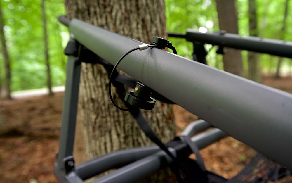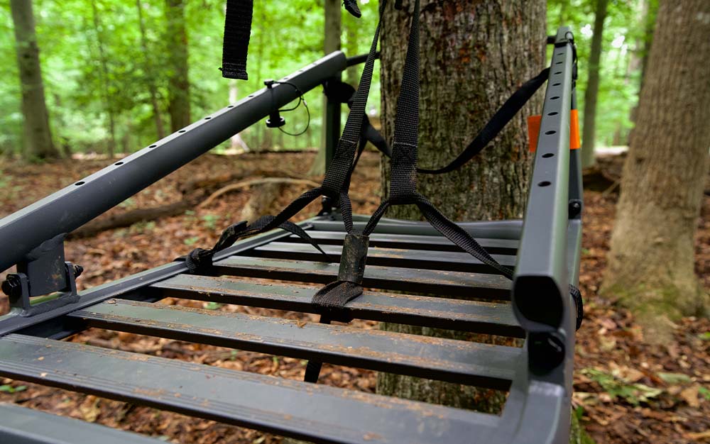 We found the stand easy to hang with the two included ratchet straps. It was fairly quiet during setup, with the only real noise coming from the ratchets. It was silent once on the tree thanks to a few smart features. Each connection point has Teflon washers, so you’ll never have to worry about an ill-timed squeak blowing your hunt. Also, Summit’s Dead Metal Sound Deadening Technology fills portions of the stand with expanding foam. We tested that tech by tapping our metal wedding bands against the stand and were impressed with the dull, muted sound rather than a high-pitched “ting.”