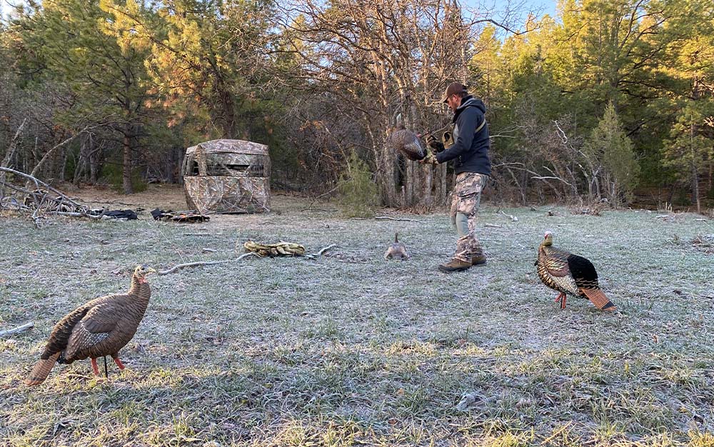 If you’re hunting near a known roost, you should be in your blind and set before first light. Turkeys have remarkable eyesight and instantly pick you off from an elevated position, so you’ll want to slip in well before shooting light.