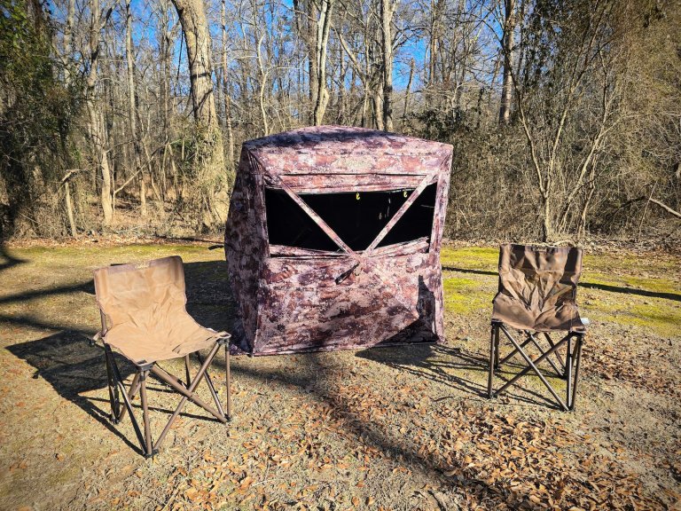 While this blind is a pretty hefty beast to get into the woods, I discovered plenty of things to love once I got it there. It is spacious enough for you and a hunting buddy, offers enough headroom for me to stand up and stretch (I’m 5 foot, 4 inches tall), and provides an excellent field of view, especially for shorter hunters. The Specialist Combo includes a five-hub blind with enough room for you and a hunting partner to spread your gear. The blind offers a 300-degree view with seven shoot-through, silent-operation windows. The package also comes with two mesh-back fold-up chairs that are plenty comfortable for an all-day sit. They also sling over your shoulder when you’re ready to call it a day and head back to the truck.