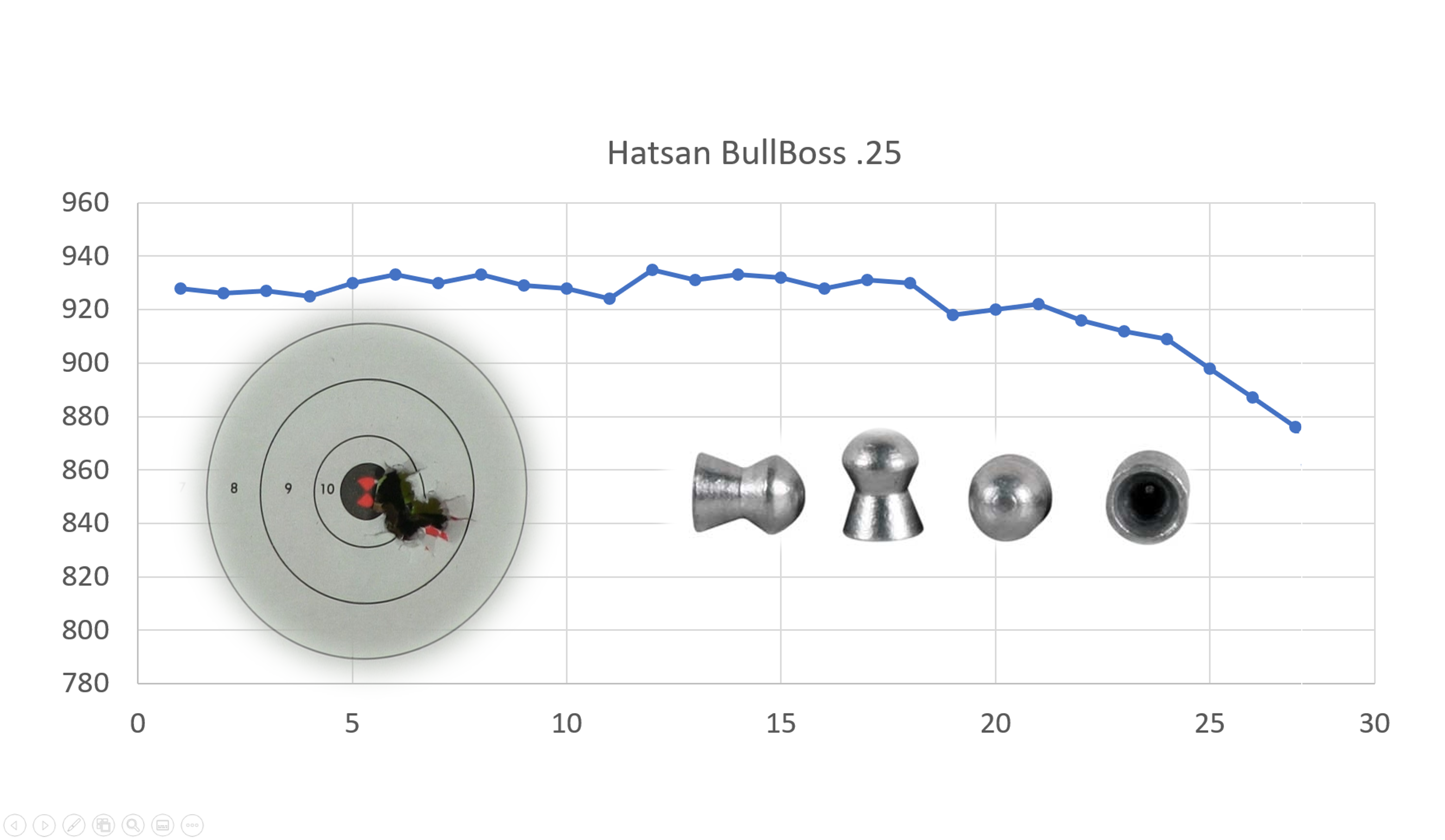 I enjoy using this PCP airgun on the range, finding it comfortable to shoot off a rest, bipod, or when practicing offhand shooting. The Hatsan BullBoss is not regulated, but the well-balanced valve provides good shot-to-shot consistency, delivering about 28 full power shots on a 200 BAR fill. Shooting over the chronograph, the gun generates an average velocity of around 921 ft-lb with the 24.7 gr Hatsan Vortex Strike pellets, which yields a power output of approximately 46 ft-lb. The accuracy is quite good, and I can shoot ¾ inch groups at 50 yards all day long with this rig.