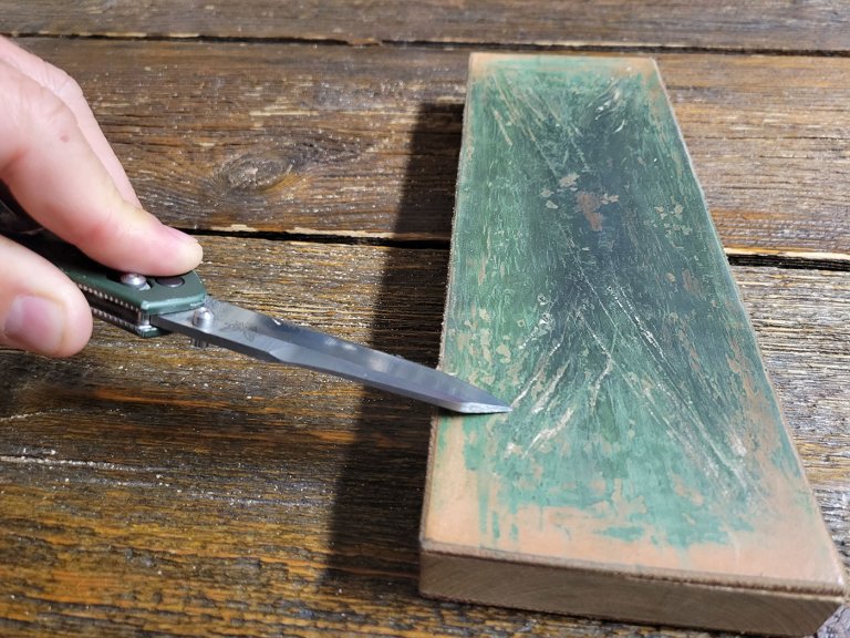There are many different compounds available for strops. Like sandpaper, they are rated by their grit. When you buy a leather strop, it’s usually bare, and has no polishing compound in it. You will need to “load” the strop before you use it. There are tons of choices ranging from paste, to bars of compound, to diamond emulsion sprays to load your strop. I generally use the bars, and rub each strop with a different compound from coarsest to finest. You don’t need multiple strops, but most have two sides for a coarse and fine compound. Load your strop with some compound by rubbing it in, or spraying it on, then grab your knife and get ready.