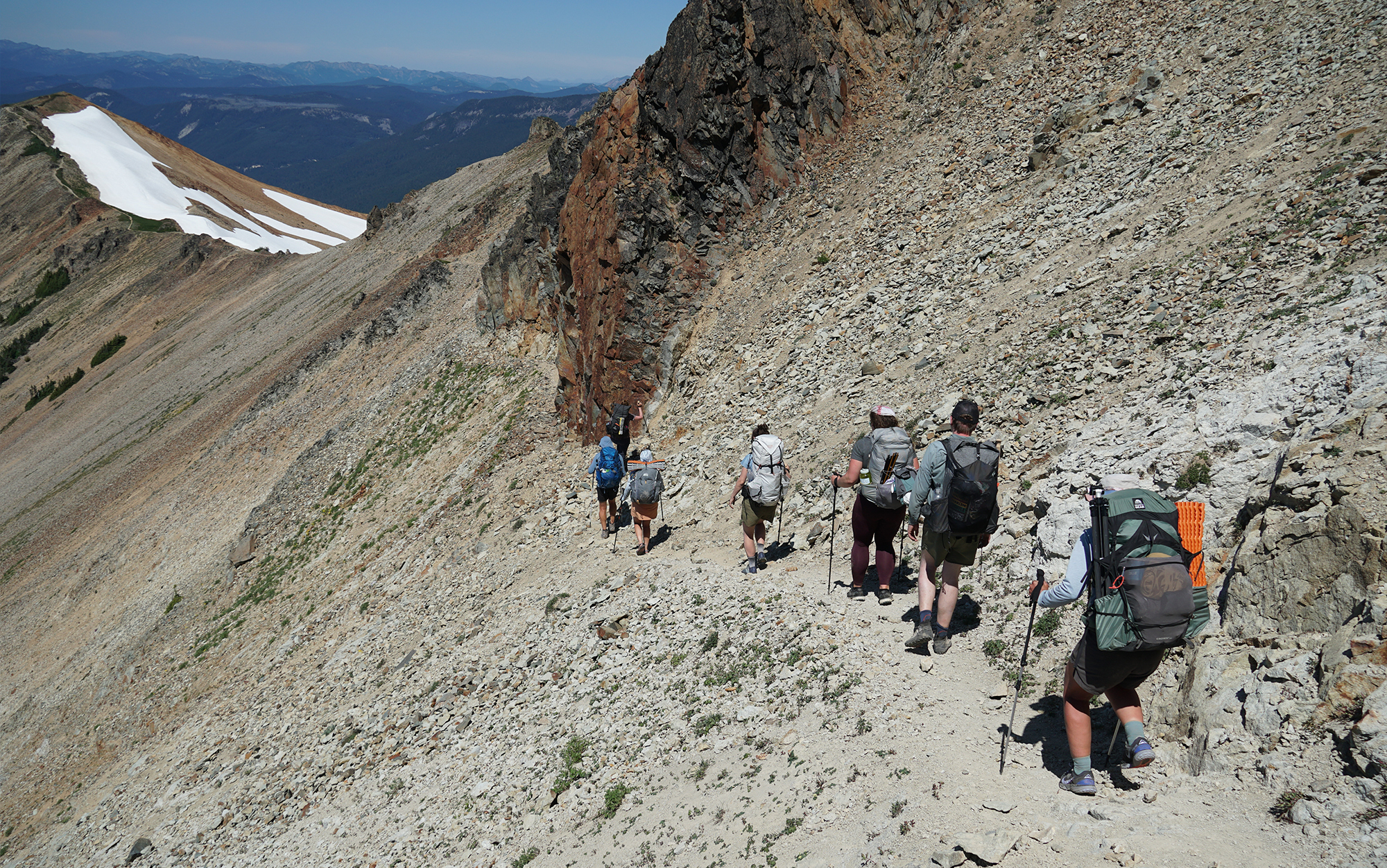 Use your trekking poles to help you climb steep grades by pulling yourself toward your front pole and thrusting upward with the other. You can also lower your grip or pole length if it feels comfortable because the ground is closer to you.