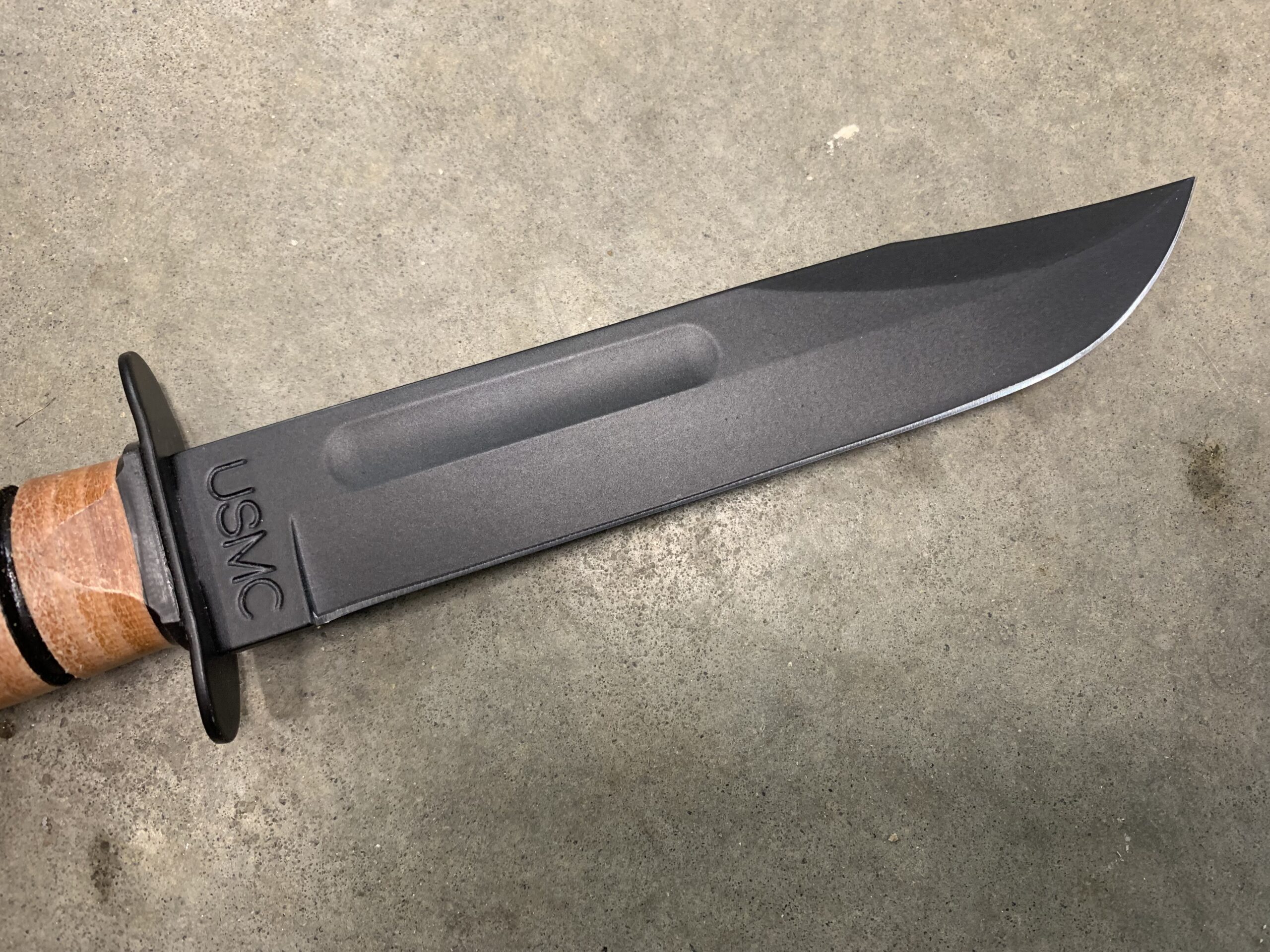 Original Ka-Bar knives were given a Parkerized finish—common for many steel tools and weapons of that era. Today, the USMC fighting and utility knife is given a black epoxy powder coating. The blade itself is now made from 1095 Cro-Van steel, which is 1095 carbon steel with added Chromium and Vanadium to aid edge retention and durability. This carbon steel is tough, holds an edge well, and is relatively easy to resharpen.
