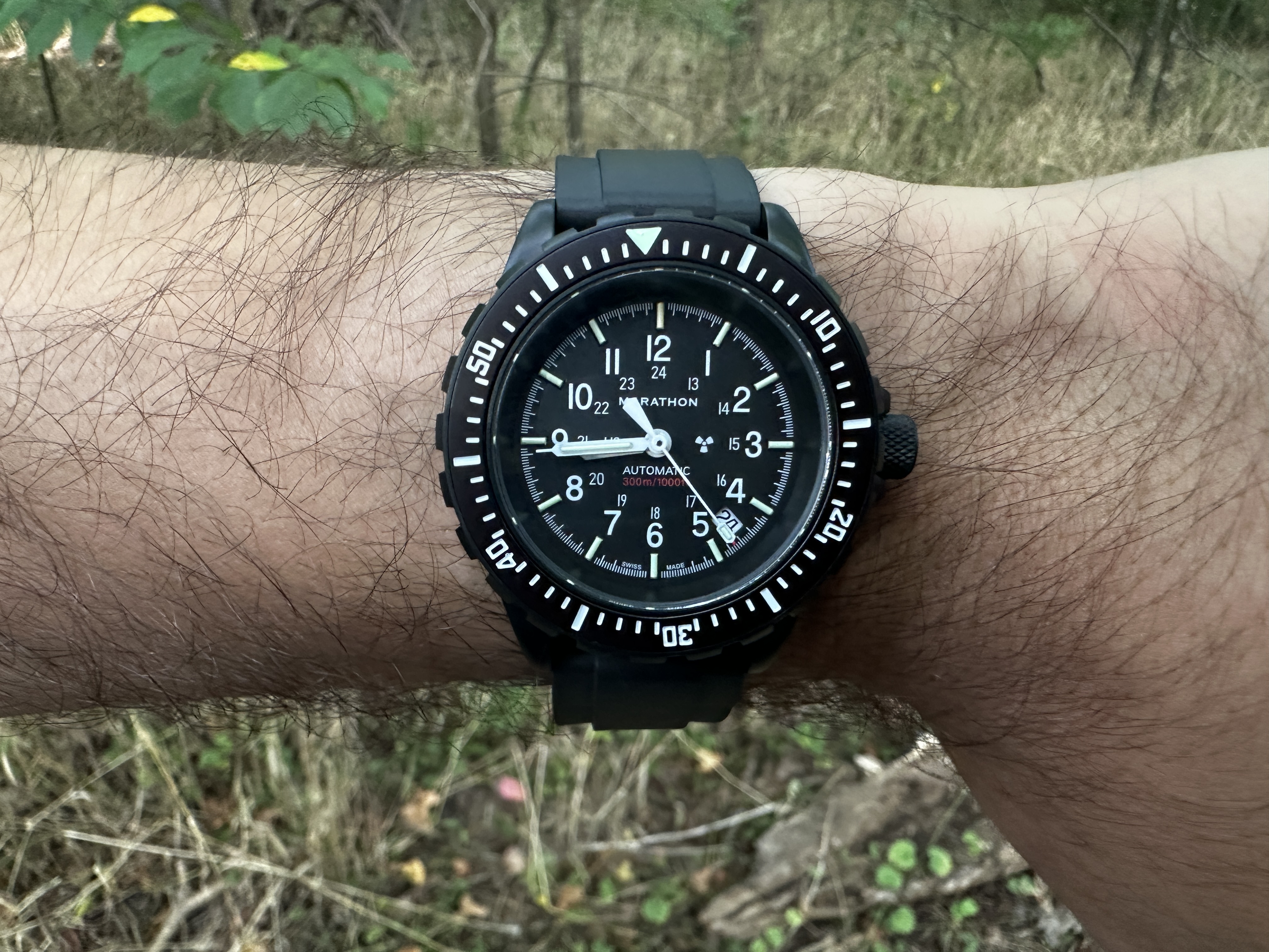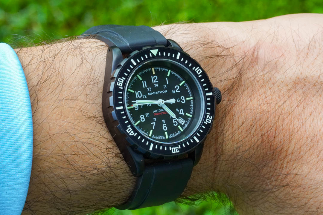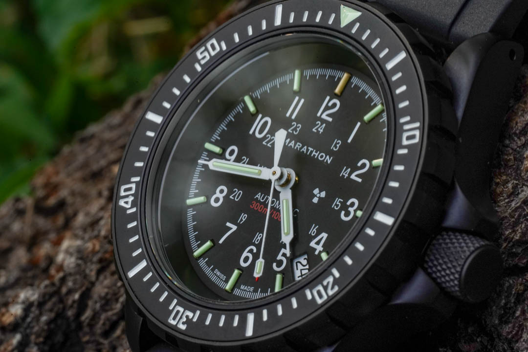 The dial has a lot of text that includes the Marathon logo, automatic designation, depth rating, 24 hour markings, and the radioactive labels. Whether or not that is too much text is purely a matter of personal preference. For me, the fine font that Marathon uses helps reduce the cluttered feeling and overall I like the dial’s look.
