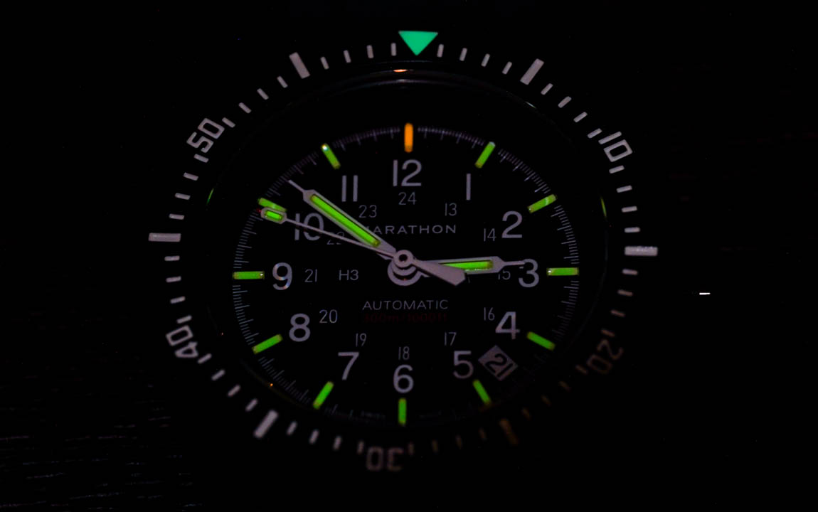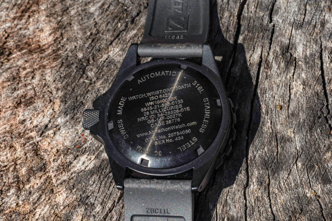 Tritium is a radioactive substance and that’s why there’s a radioactive and H3 symbol printed on the dial. You’ll also see engraving on the caseback indicating Marathon’s license from the Nuclear Regulatory Commission to use tritium. It’s worth noting that you’re not exposing yourself to harmful levels of radiation by wearing a Marathon watch.