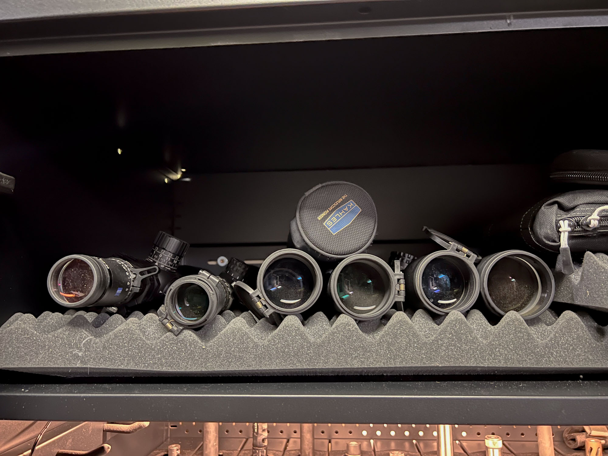 On the upper shelf I added some egg-carton foam cushioning and used it to store scopes and other delicate items.