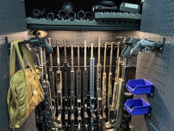 With 13 inches of space at the bottom of the cabinet I was able to slide in a full Pelican tool chest that holds some of my essential gunsmithing gear. I also stacked a bunch of pistols still in their boxes down there.