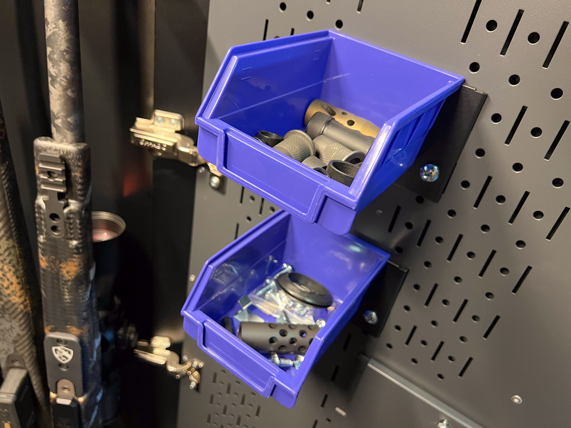 The cabinet comes with a basic set of components that lets you configure the unit as shown in this review. It has two shelves that you can set to different heights; rests for the stocks and barrels that you can position as needed; a couple of pistol holders that accommodate three handguns each; and two peg-board mounted bins for parts and pieces.