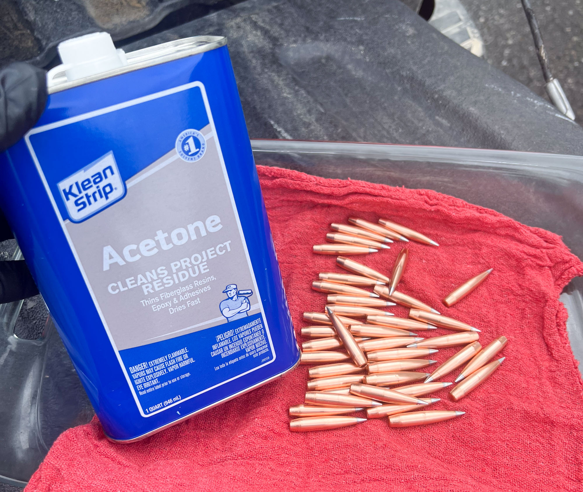 Hornady ships the A-Tips with a felt Crown Royal-type bag you can use to wipe them down, but that gets old quick when you have dozens of rounds to load. Instead, spread out a lint-free shop rag and dump your bullets on it. Sprinkle acetone on the bullets and rag. Roll the rag like a burrito and grab both ends. Rock the bullets back and forth in the rag for a minute and that will remove the lubricant without damaging the projectiles.