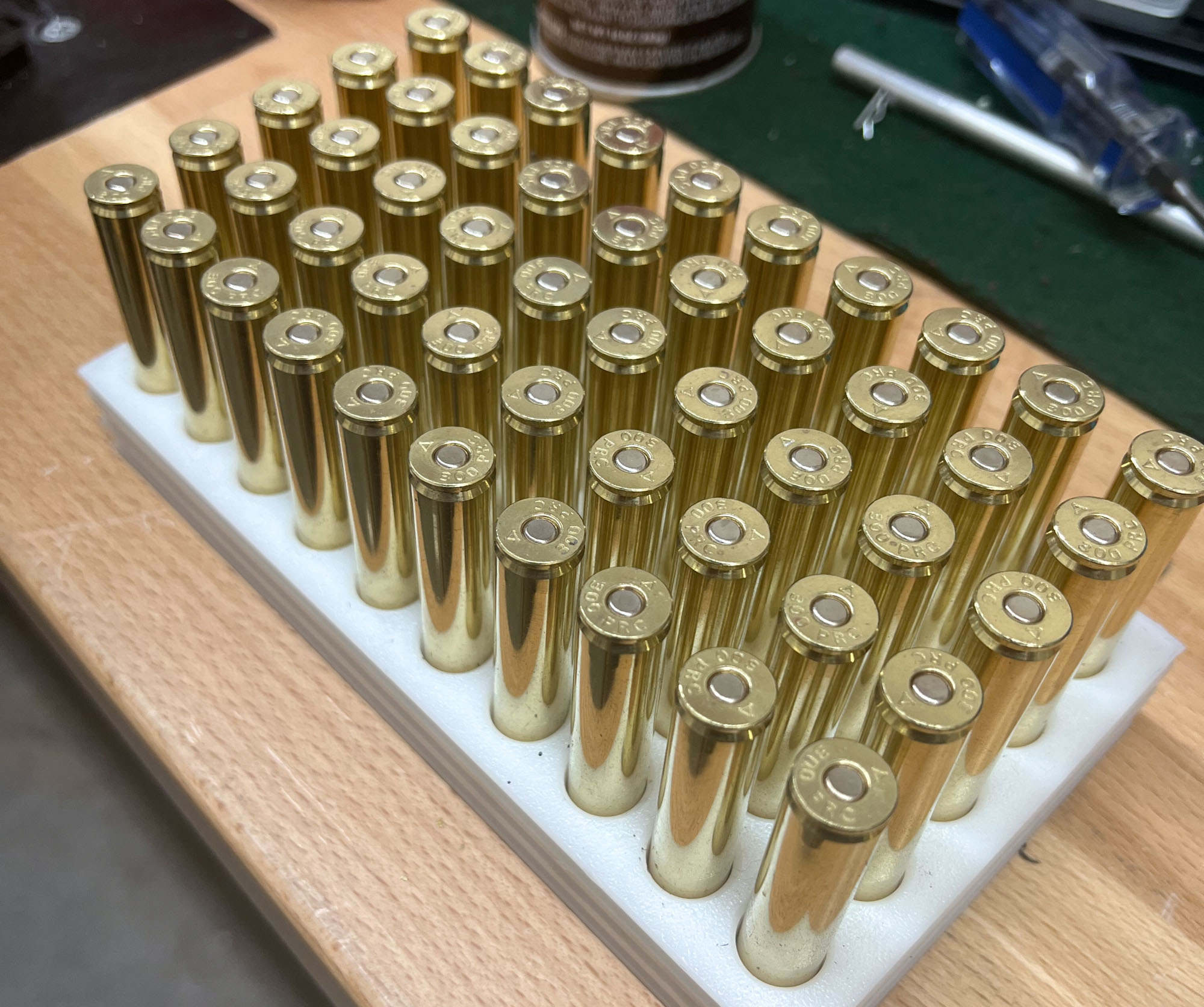 I primed my brass on a Primal Rights Competition Primer Seater. For speed and accuracy, no other priming system can match it. I can prime 100 cases in eight minutes on it, with all the primers seated to a precise depth, which the user can adjust. In the case of these .300 PRC rounds, I seated the 210Ms .003 inch below flush.