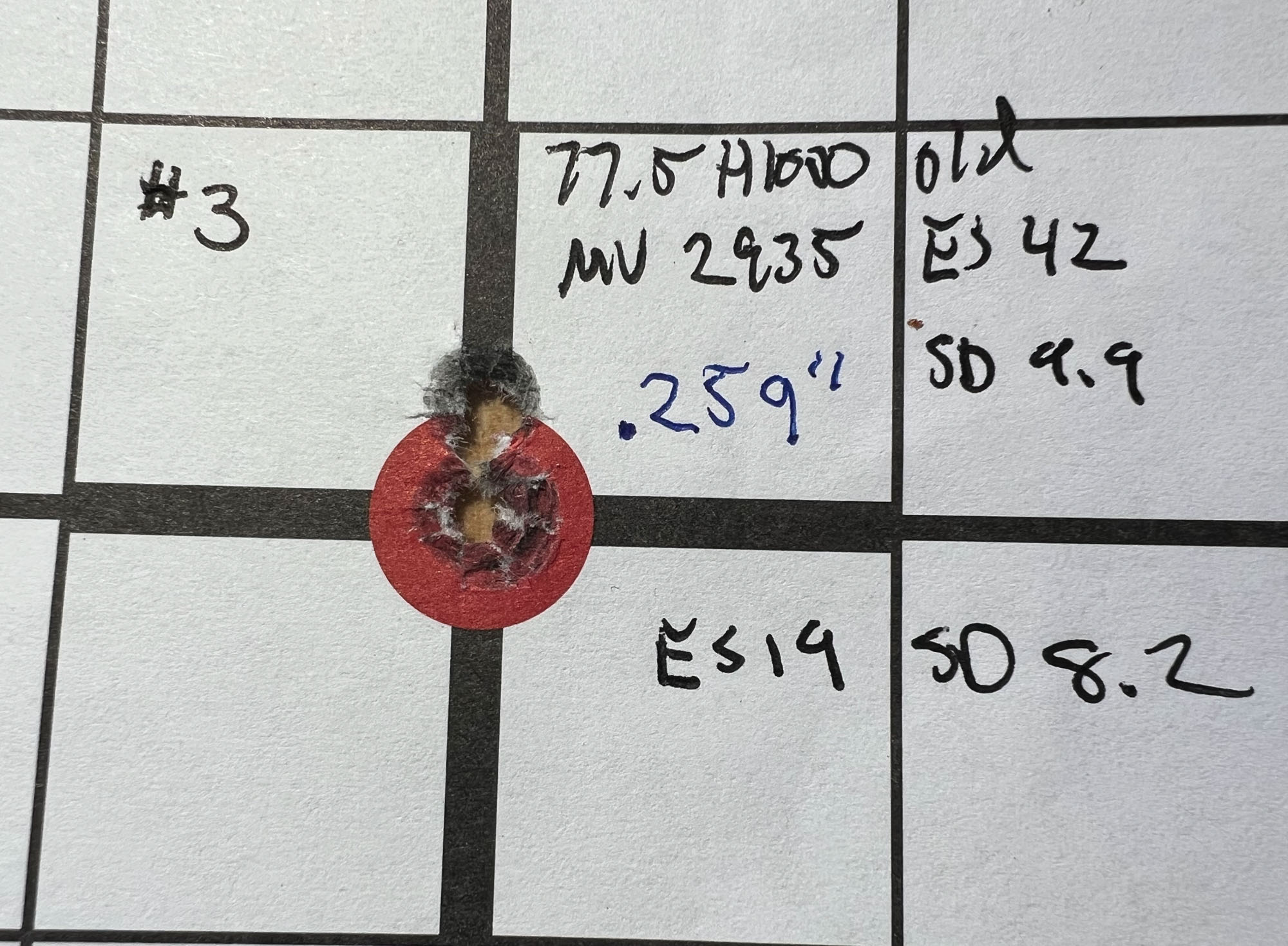 I quickly saw there was a bit of a difference in my velocities. The older H1000 was about 25 fps faster per given charge weight than the new stuff. While 76.5 grains of the older lot got me around 2940 fps, it took 77.0 grains of the new H1000 to hit the same speed.