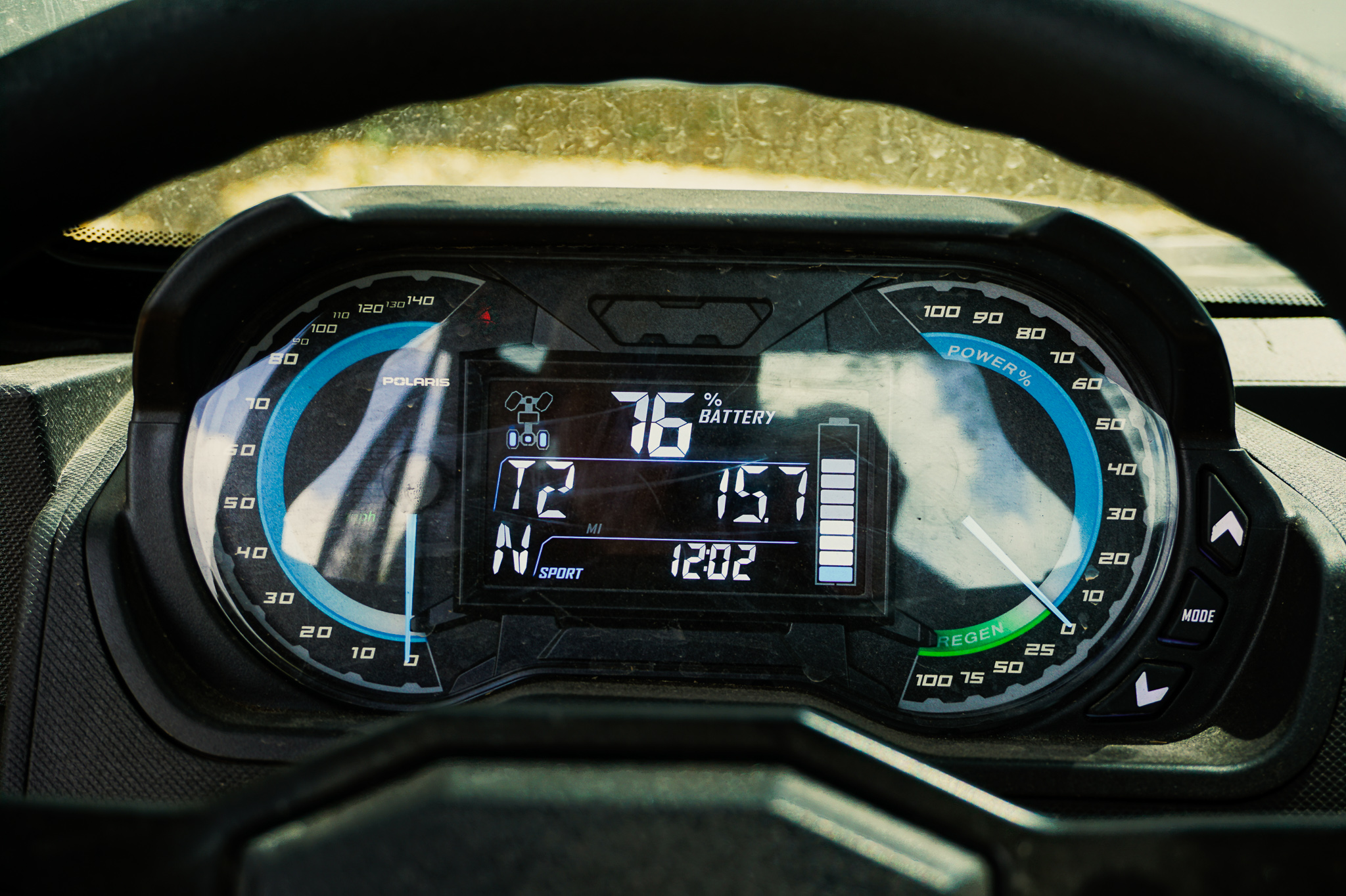 There are three drive modes that essentially control torque: Eco, Standard, and Sport. (The Eco mode limits torque and your top speed to conserve battery.) The regenerative braking kicks in whenever the UTV is moving forward and your foot is off the gas to automatically recharge the Kinetic.